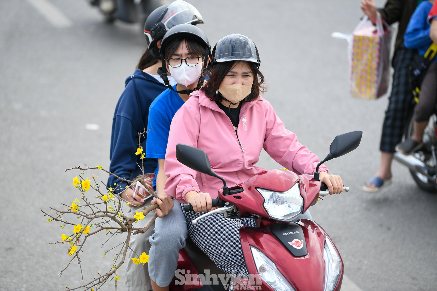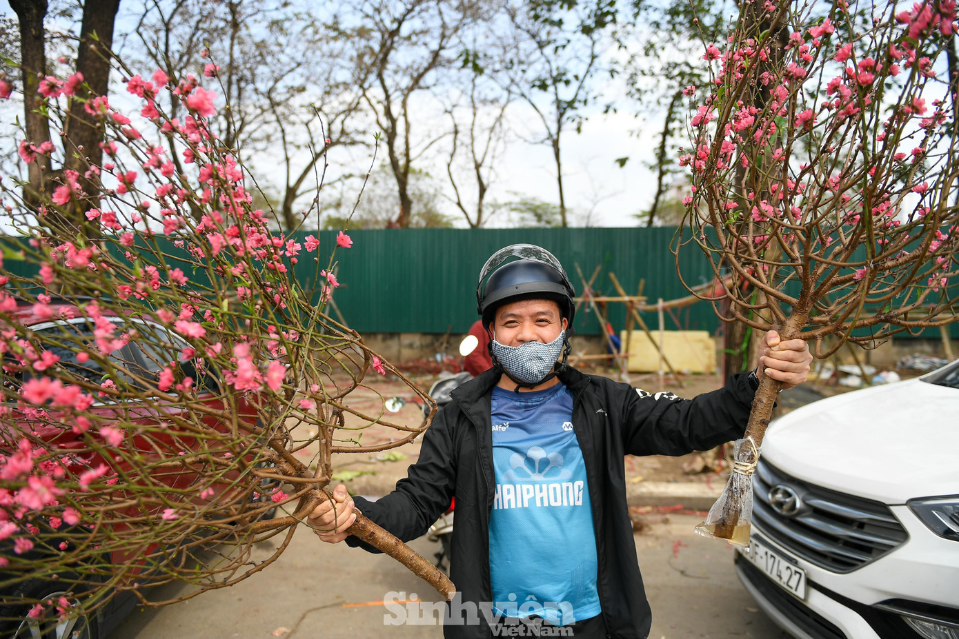 Minh Anh (sinh viên một trường đại học ở Cầu Giấy) tranh thủ cùng người thân đến chợ chọn đào. “Bọn mình chờ chiều cuối năm vì giá dễ chịu hơn. Vẫn có nhiều cành đẹp nếu chịu khó chọn,” Minh Anh chia sẻ.