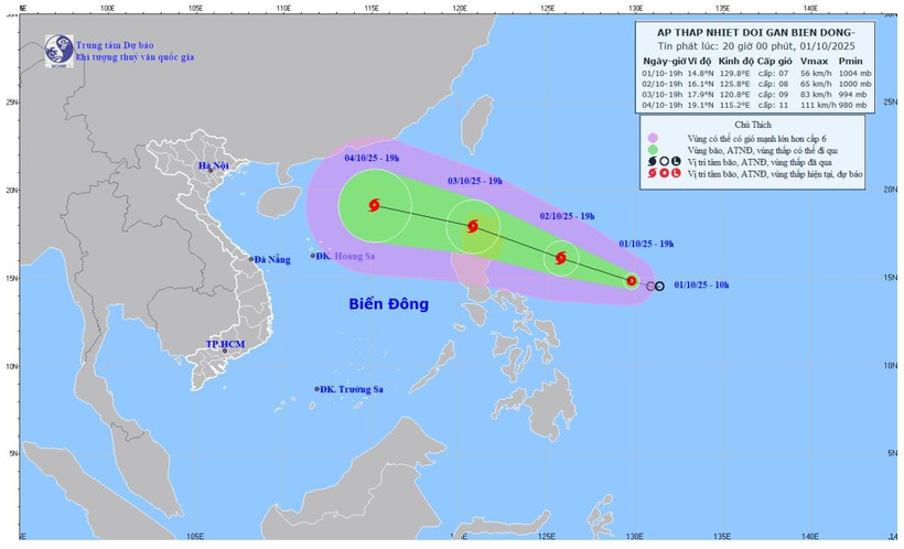 Theo Giám đốc Trung tâm Dự báo khí tượng thủy văn quốc gia Mai Văn Khiêm, hồi 19 giờ tối 1/10, vị trí tâm áp thấp nhiệt đới ở vào khoảng 14,8 độ vĩ bắc; 129,8 độ kinh đông, trên vùng biển phía đông Philippines. Sức gió mạnh nhất vùng gần tâm áp thấp nhiệt đới mạnh cấp 7 (50-61km/giờ), giật cấp 9. Di chuyển theo hướng tây tây bắc với tốc độ khoảng 15km/giờ.
