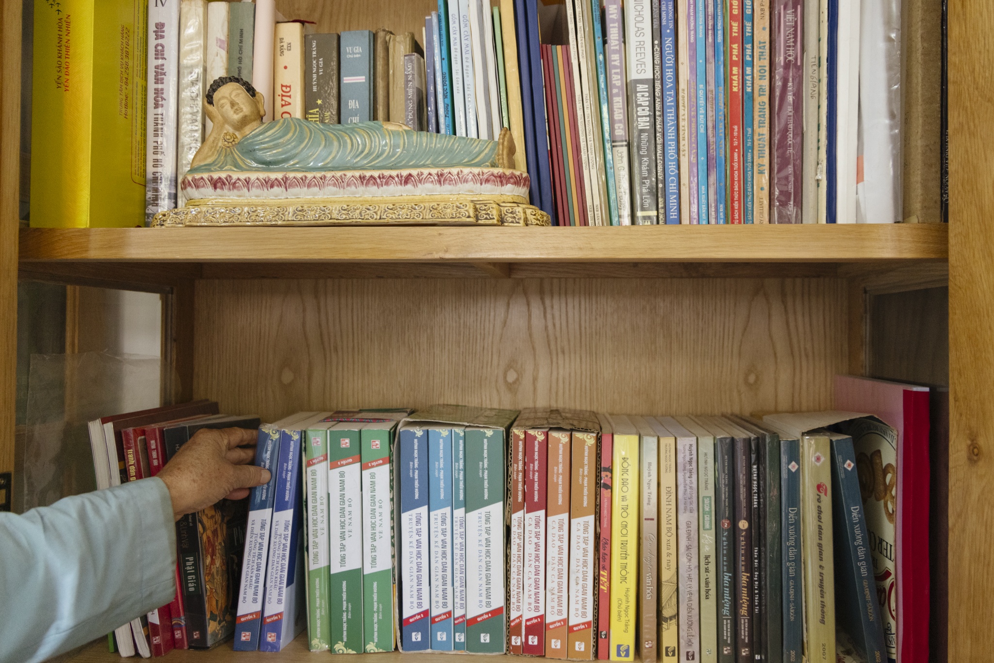 Thế là tôi đi lượm tượng ông Địa, người ta bỏ ngoài gốc cây, vỉa hè, lượm mãi thì được 1 tủ 400 ông rồi viết cuốn sách Thần Đất - Ông Địa và Thần Tài.
