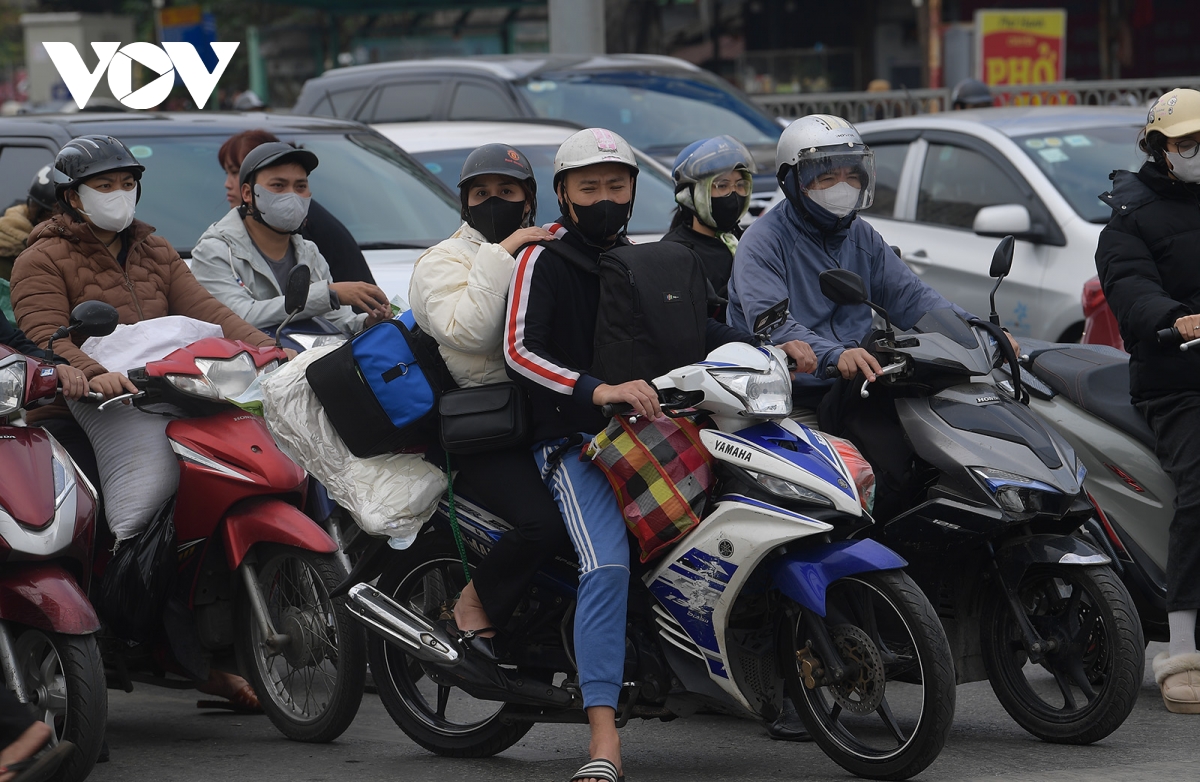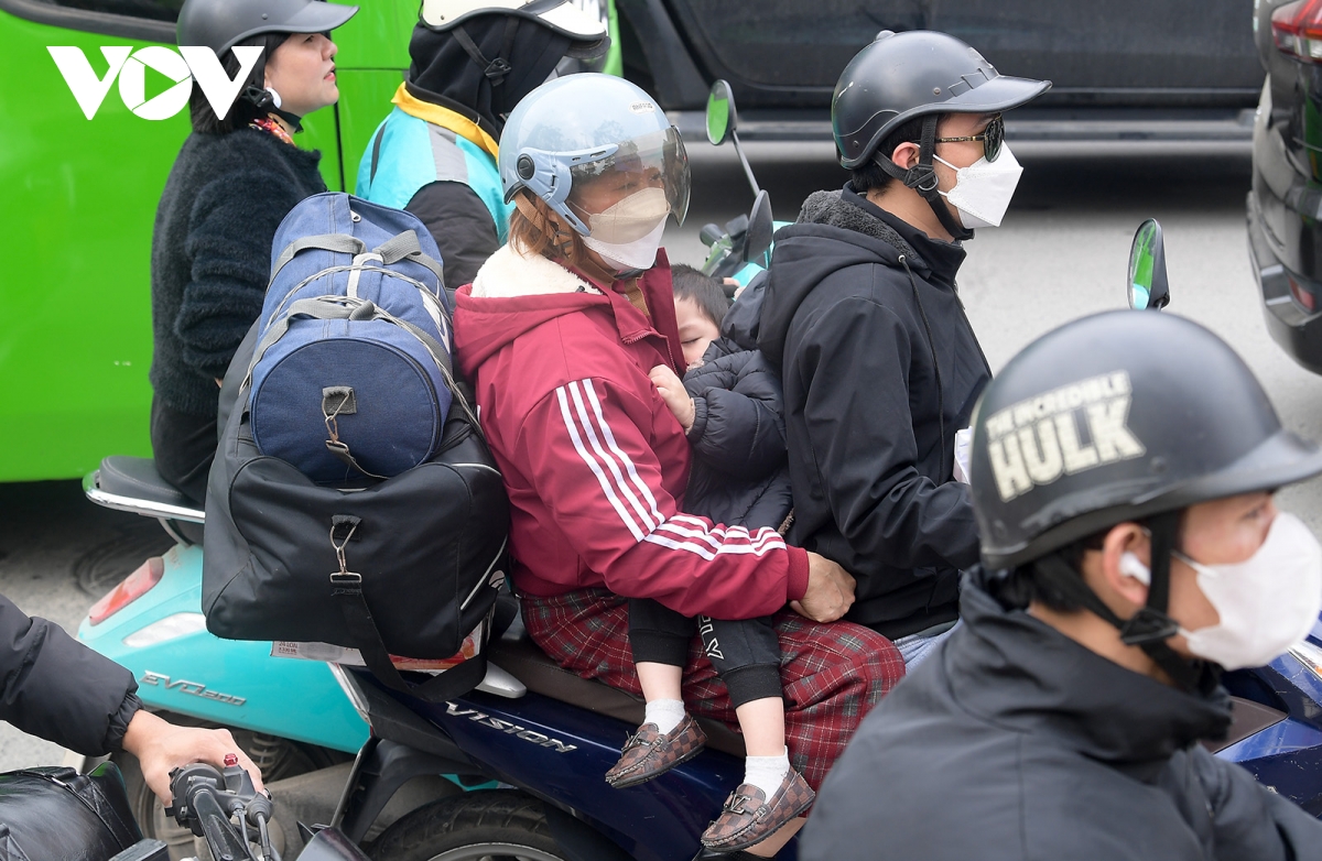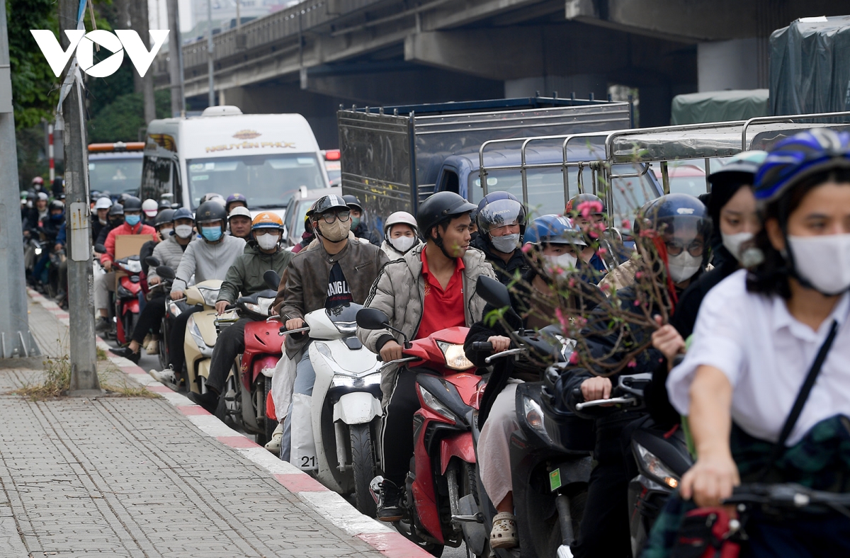 Phía bên ngoài các bến xe, áp lực giao thông tăng cao đột biến, người và phương tiện chở đủ các loại đồ đạc trở về quê đón Tết