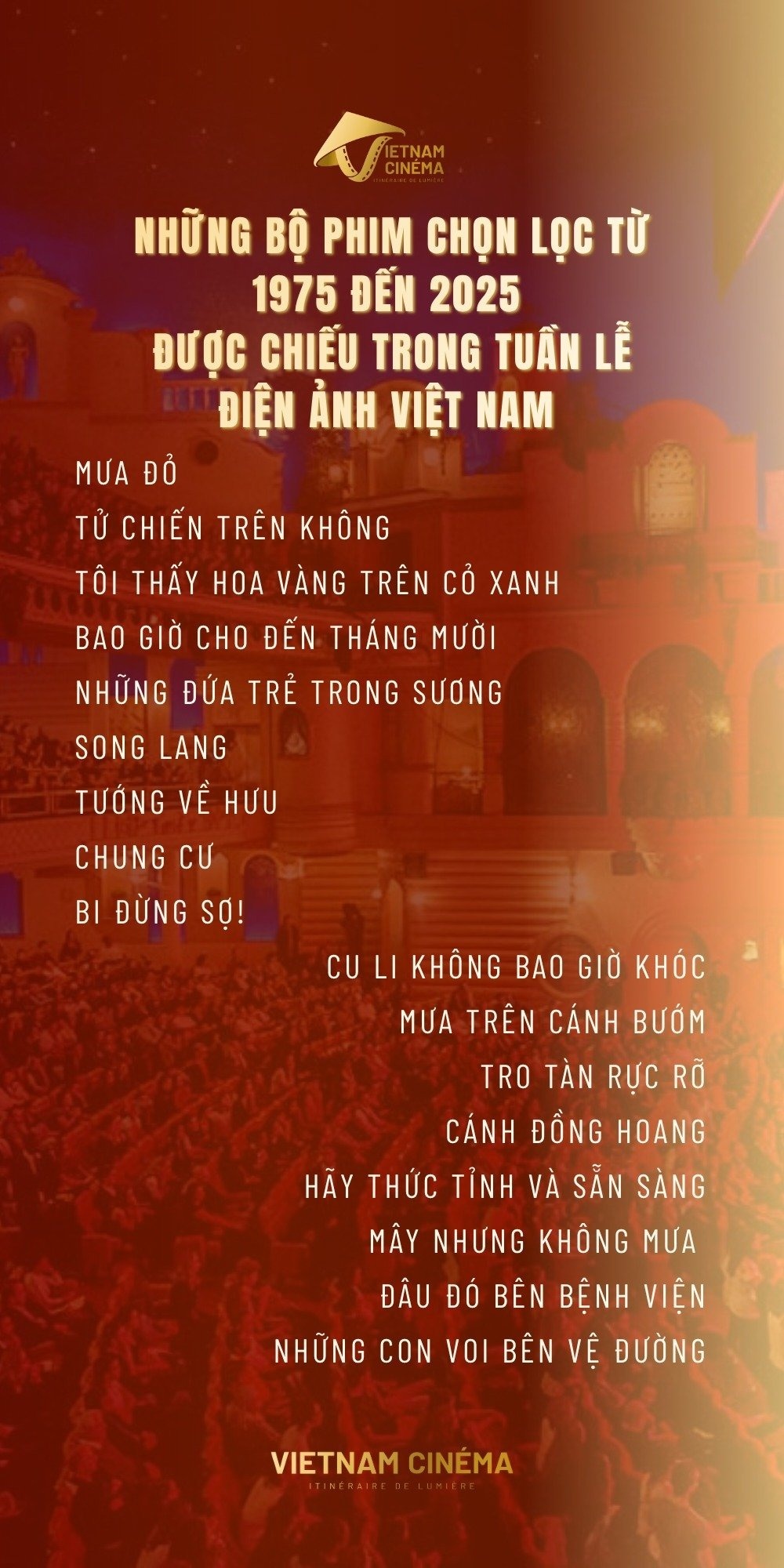 Diễn ra trong khoảng thời gian từ 5/12-12/12, tuần lễ phim sẽ giới thiệu 17 bộ phim được tuyển chọn bởi hội đồng chuyên môn, phản ánh phần nào hành trình 50 năm phát triển của điện ảnh Việt Nam trong giai đoạn 1975-2025.