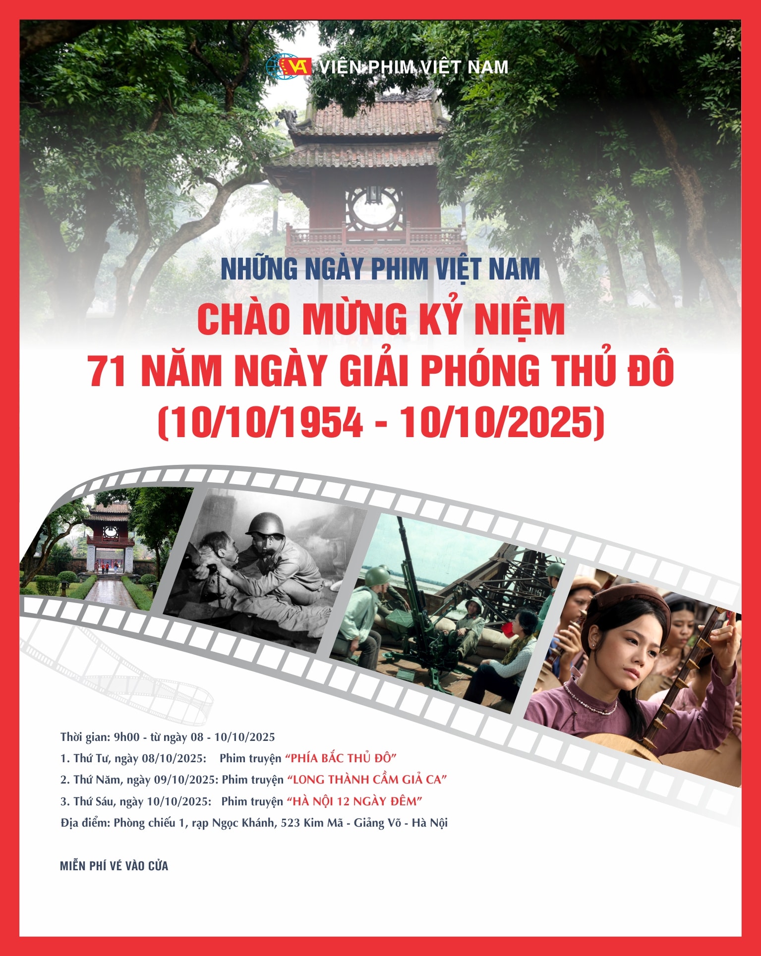 Các phim được chiếu dịp này là “Phía Bắc Thủ đô” (9h ngày 8-10), “Long thành cầm giả ca” (9h ngày 9-10), “Hà Nội 12 ngày đêm” (9h ngày 10-10).