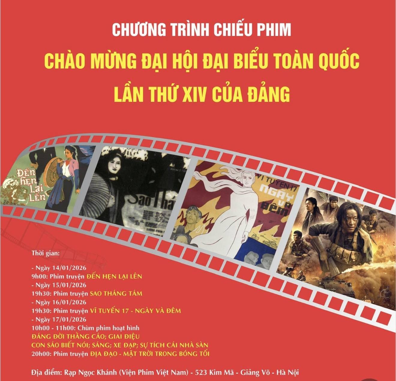 Ngày 17/1 sẽ có 2 suất chiếu: vào 10h, chiếu chùm phim hoạt hình: Đáng đời thằng cáo, Con sáo biết nói, Giai điệu, Sáng, Xe đạp, Sự tích cái nhà sàn; vào 20h, chiếu phim Địa đạo - Mặt trời trong bóng tối (HKFilm sản xuất năm 2025, đạo diễn Bùi Thạc Chuyên). Phim đạt giải Bông sen Bạc tại Liên hoan phim Việt Nam lần thứ XXIV.