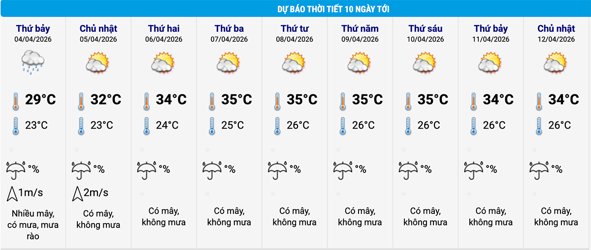Sang ngày 5/4, khu vực này nắng ráo trở lại, trời có mây, không mưa, nhiệt độ tăng lên cao nhất 32°C, thấp nhất duy trì mức 23°C.