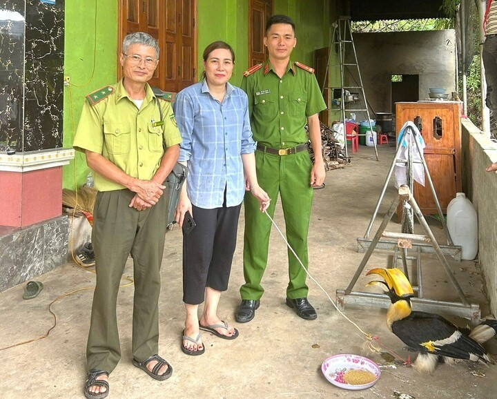 Ngày 8/10, Công an xã Tân Kỳ (Nghệ An) phối hợp với Hạt Kiểm lâm Tân Kỳ và UBND xã tiến hành thả một cá thể chim hồng hoàng quý hiếm về môi trường tự nhiên. Ảnh: Báo Văn hóa.