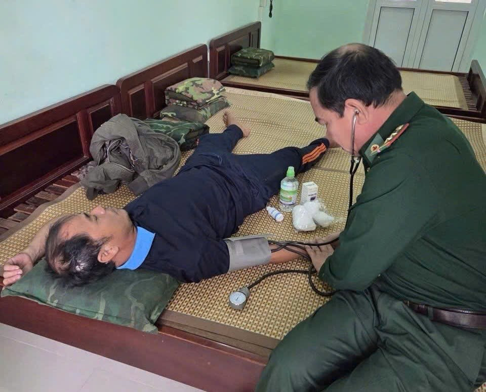 Bác sĩ Quân y kiểm tra sức khỏe cho ngư dân sau khi tự bơi vào bờ an toàn.