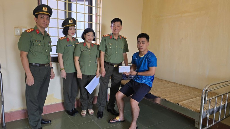 Phó Giám đốc Công an tỉnh Thái Nguyên thăm hỏi, động viên Đại úy Dương Quang Huy.