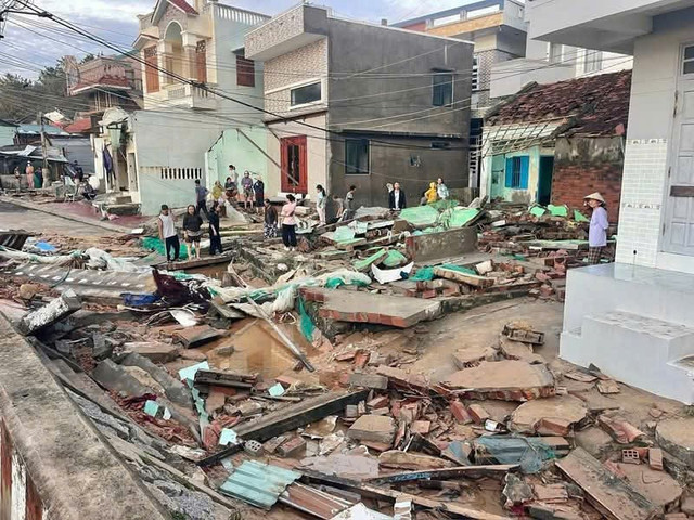 Nhiều nhà dân tại làng chài Nhơn Hải (tỉnh Gia Lai) đổ sập khi bão số 13 (Kalmaegi) quét qua khu vực này.