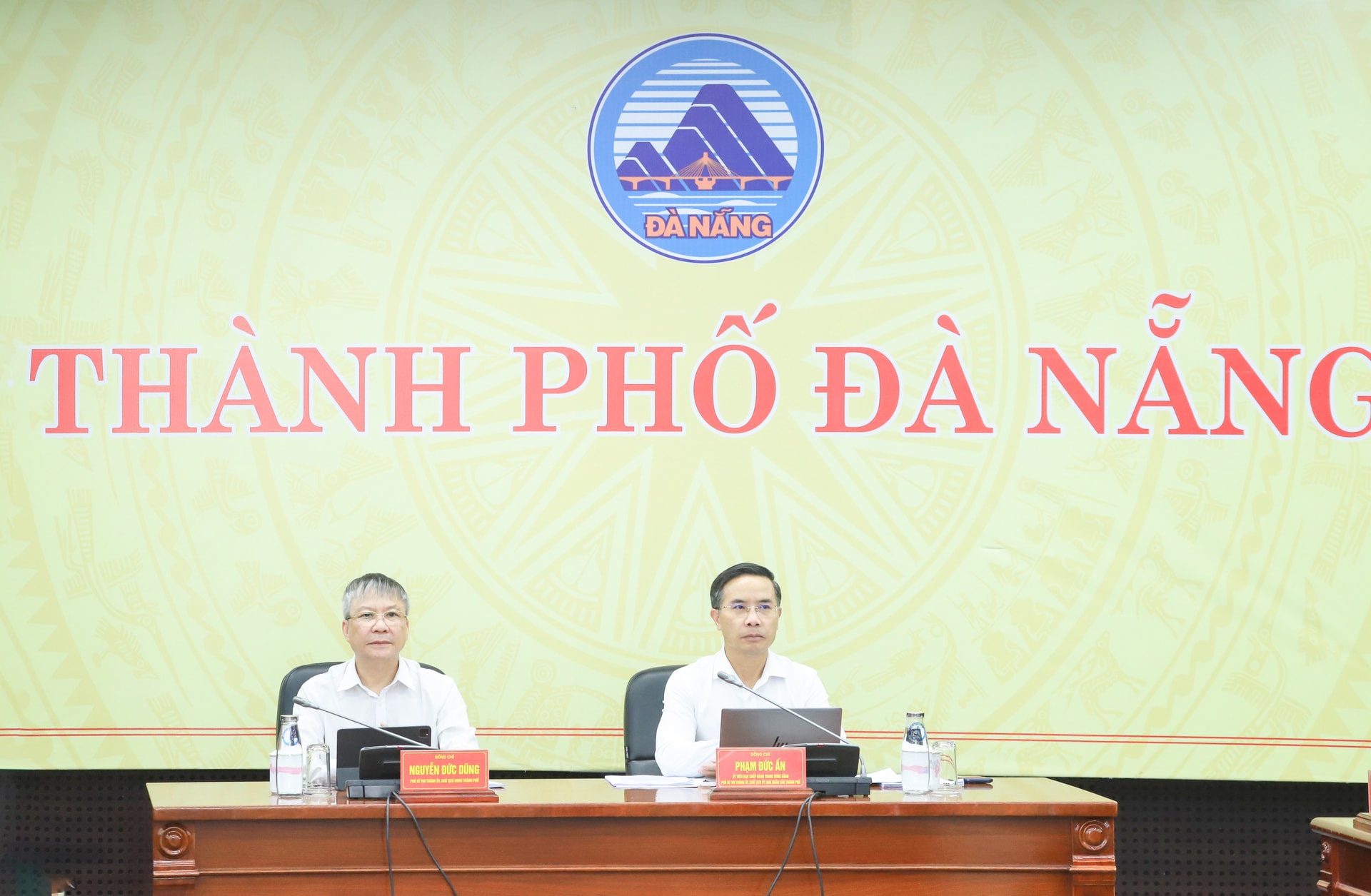Chủ tịch UBND thành phố Phạm Đức Ấn (bên phải) và Chủ tịch HĐND thành phố Nguyễn Đức Dũng chủ trì điểm cầu Đà Nẵng. Ảnh: NGỌC PHÚ