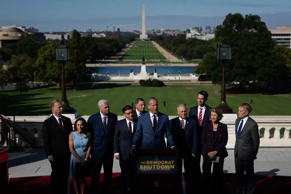 Lãnh đạo phe đa số Cộng hòa tại Thượng viện John Thune (giữa) cùng Chủ tịch Hạ viện Mike Johnson và các lãnh đạo Cộng hòa khác phát biểu tại Điện Capitol vào ngày 1-10. Ảnh: THE NEW YORK TIMES