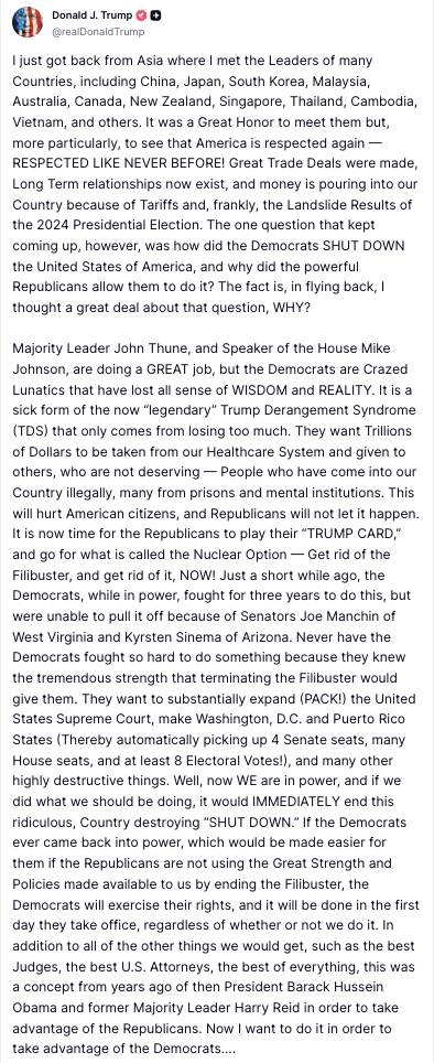 Tối muộn hôm 30/10 (giờ địa phương), ông Trump kêu gọi đảng Cộng hòa chấm dứt tình trạng đóng cửa chính phủ bằng cách kích hoạt cái gọi là “phương án hạt nhân”, tức là loại bỏ thủ tục filibuster (thủ tục cản trở) và ngưỡng 60 phiếu tại Thượng viện. Làm vậy, đảng Cộng hòa có thể thông qua các dự luật chỉ bằng đa số đơn giản trong Thượng viện do họ kiểm soát.
