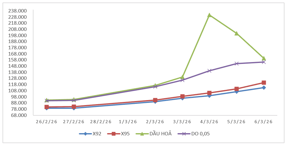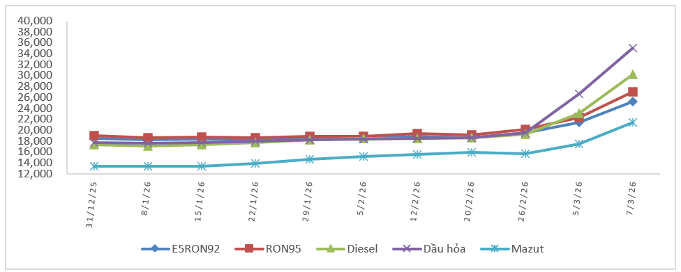 Biến động giá bán xăng dầu trong nước năm 2026 (31/12/2025 đến 07/3/2026)