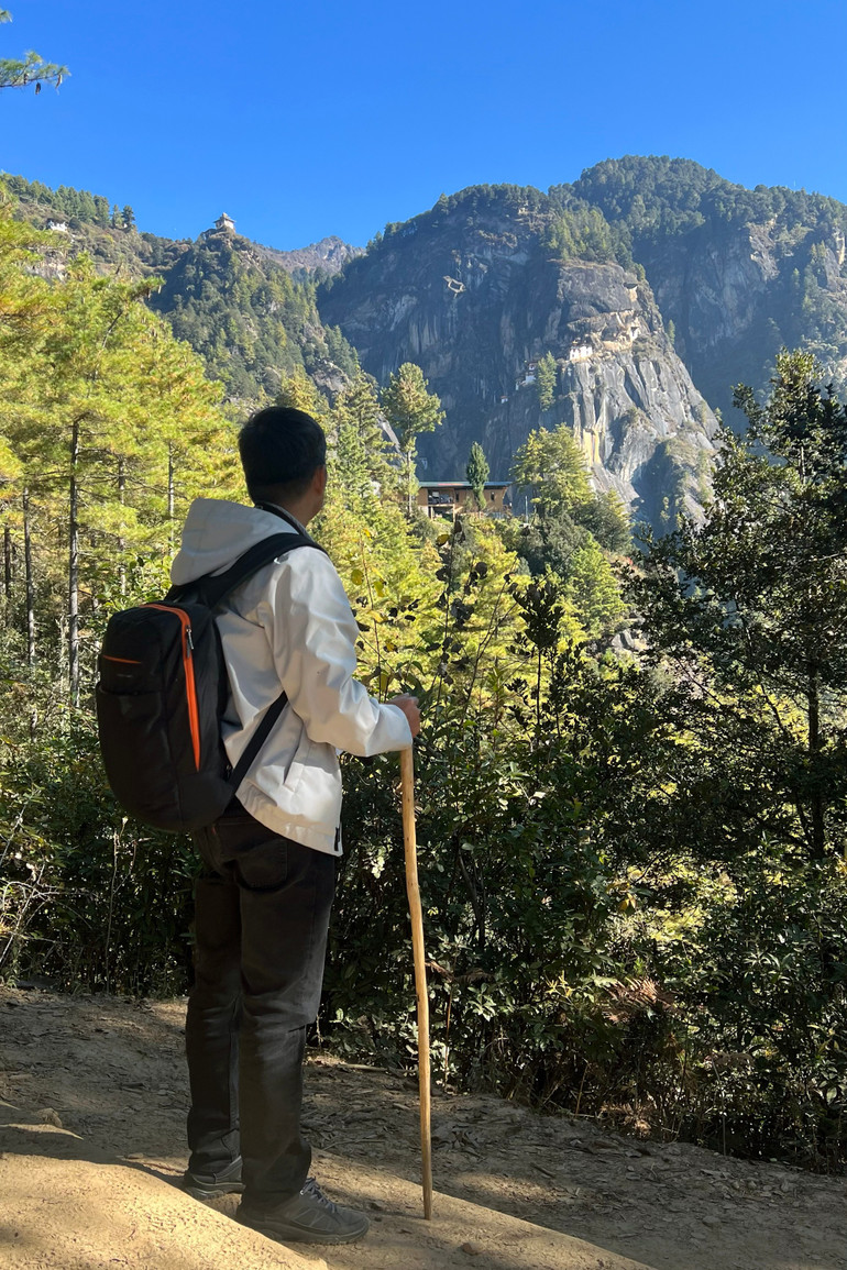 Từ đây, nhìn lên, Tiger’s Nest bắt đầu hiện rõ, tựa giấc mơ treo giữa tầng mây. Nhìn xuống, thung lũng Paro hiện ra mênh mang dưới những lớp sương mỏng, đường làng, mái nhà chỉ nhỏ như dấu chấm.