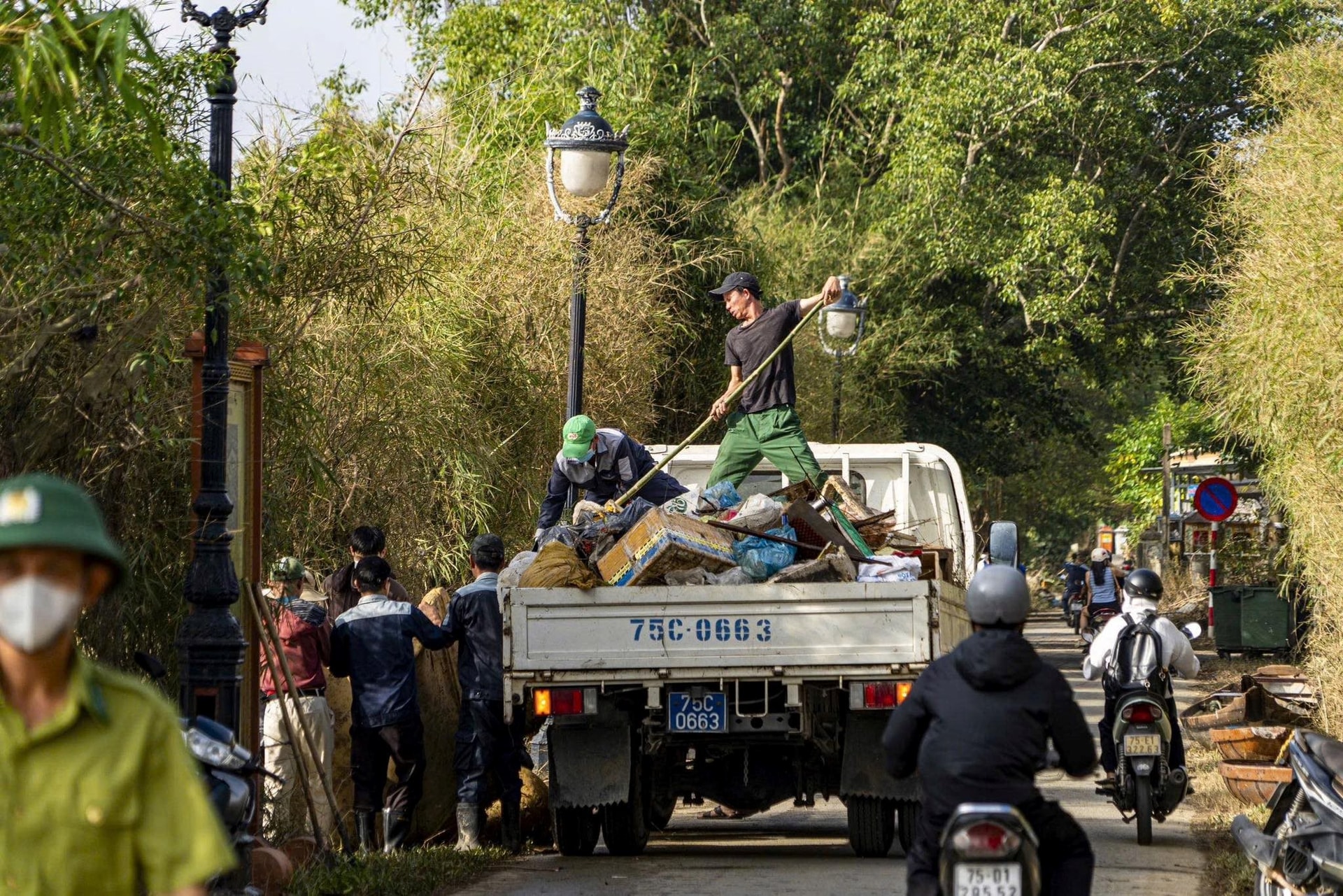 Tại phường Phong Dinh, Chủ tịch UBND thành phố đến thăm, động viên lực lượng đang dọn dẹp tại trục đường chính dẫn vào Làng cổ Phước Tích. Với phương châm “Nước rút đến đâu, dọn đến đó”, người dân và các lực lượng tại đây đã khẩn trương bắt tay khắc phục hậu quả thiên tai, đảm bảo vệ sinh môi trường.