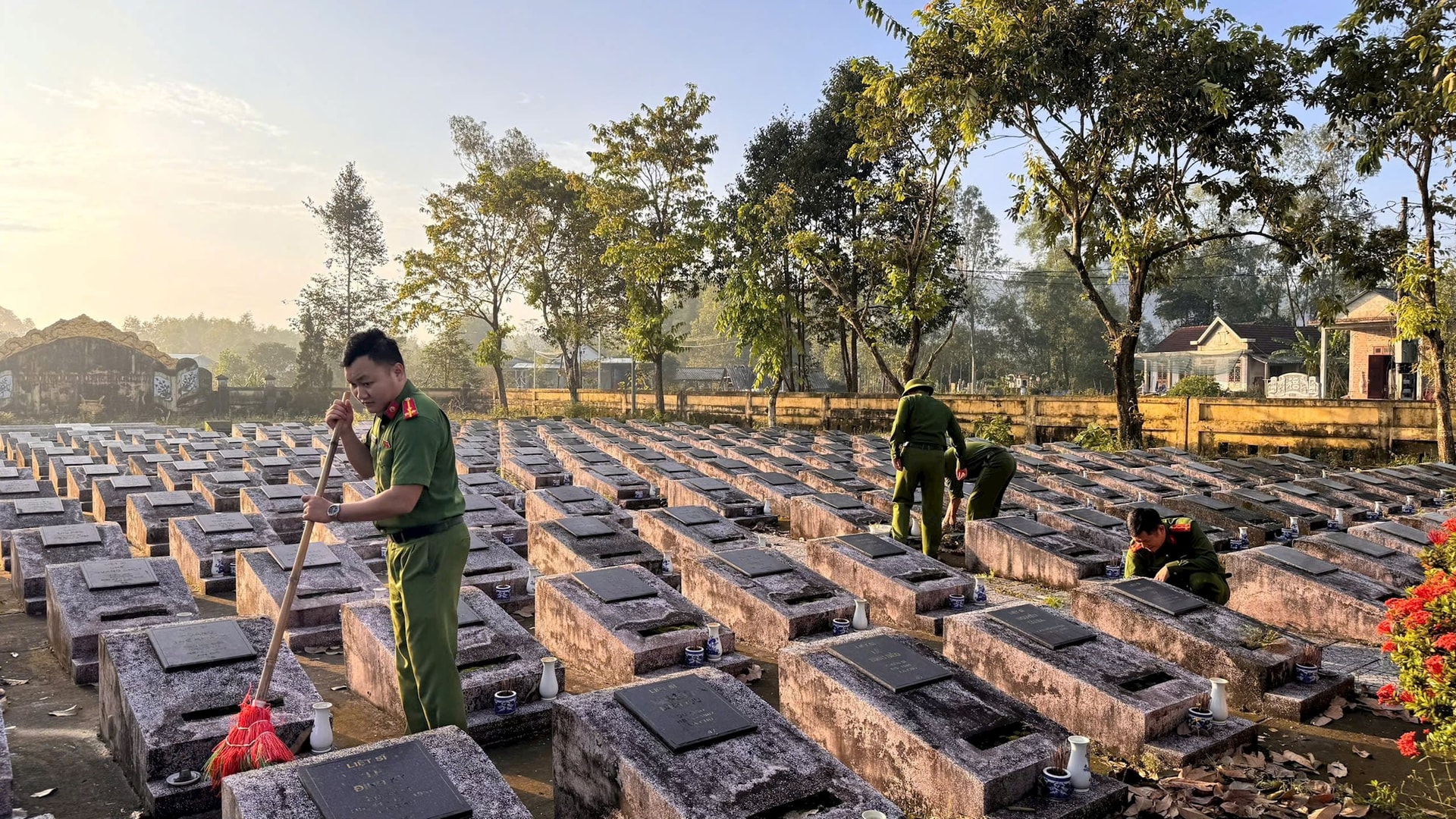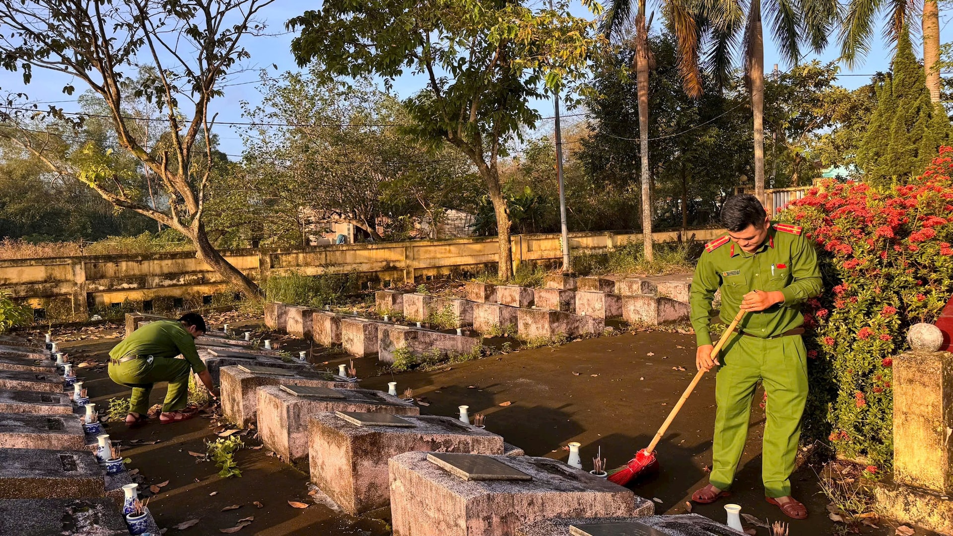 Vệ sinh tại nghĩa trang liệt sĩ sau lũ.