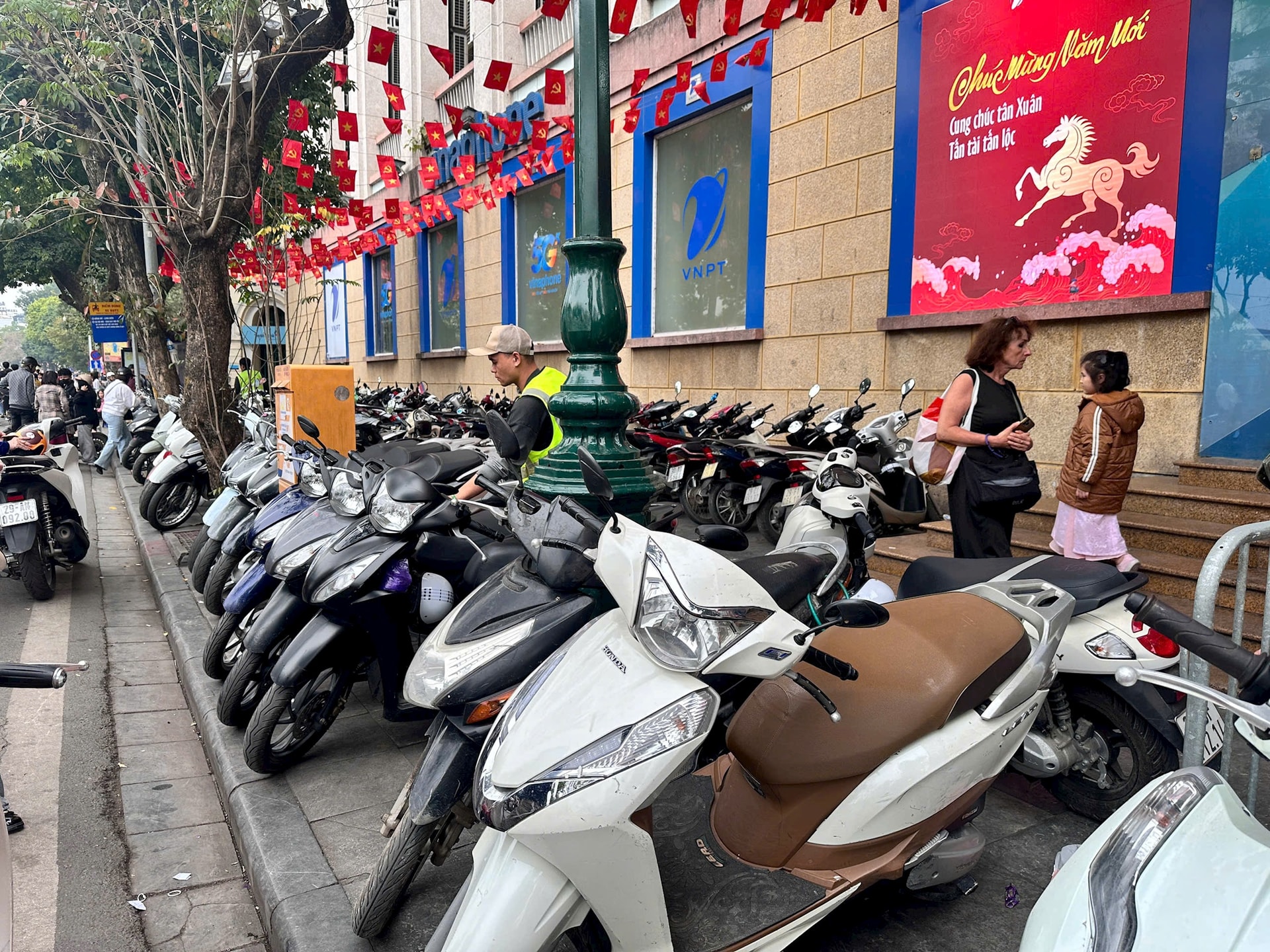 Trưa 17, 18-2 (mùng 2 và 3 Tết), các tuyến phố gần khu vực Đền Ngọc Sơn (phường Hoàn Kiếm) như Đinh Tiên Hoàng, Hàng Khay, Tràng Tiền, Bà Triệu... nhiều điểm trông giữ xe máy có ghi biển của đơn vị khai thác điểm đỗ nhưng vẫn thu phí 20.000 đồng/xe máy.