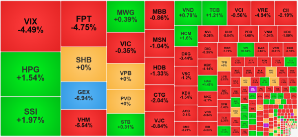 Đà giảm tăng tốc cuối phiên cũng có tác động nhất định đến tâm lý chung, khá nhiều mã giảm sâu hơn. Thống kê sàn HoSE cuối ngày có 112 cổ phiếu chốt giảm quá 1% so với tham chiếu, trong đó 55 mã giảm quá 2%. GEX từ sau 2h bị ép cực mạnh và đóng cửa giá sàn, thanh khoản hơn 600 tỷ đồng. NVL giảm 5,38% với 163,4 tỷ đồng; HHV giảm 5,04% với 159,9 tỷ; VRE giảm 4,94% với 272,4 tỷ; FPT giảm 4,75% với 990,5 tỷ; KBC giảm 4,14% với 149,7 tỷ; GMD giảm 3,79% với 163,7 tỷ; DXG giảm 3,44% với 219,5 tỷ… Tất cả các cổ phiếu này đều đóng cửa ở giá thấp nhất ngày phản ánh sức ép duy trì liên tục.