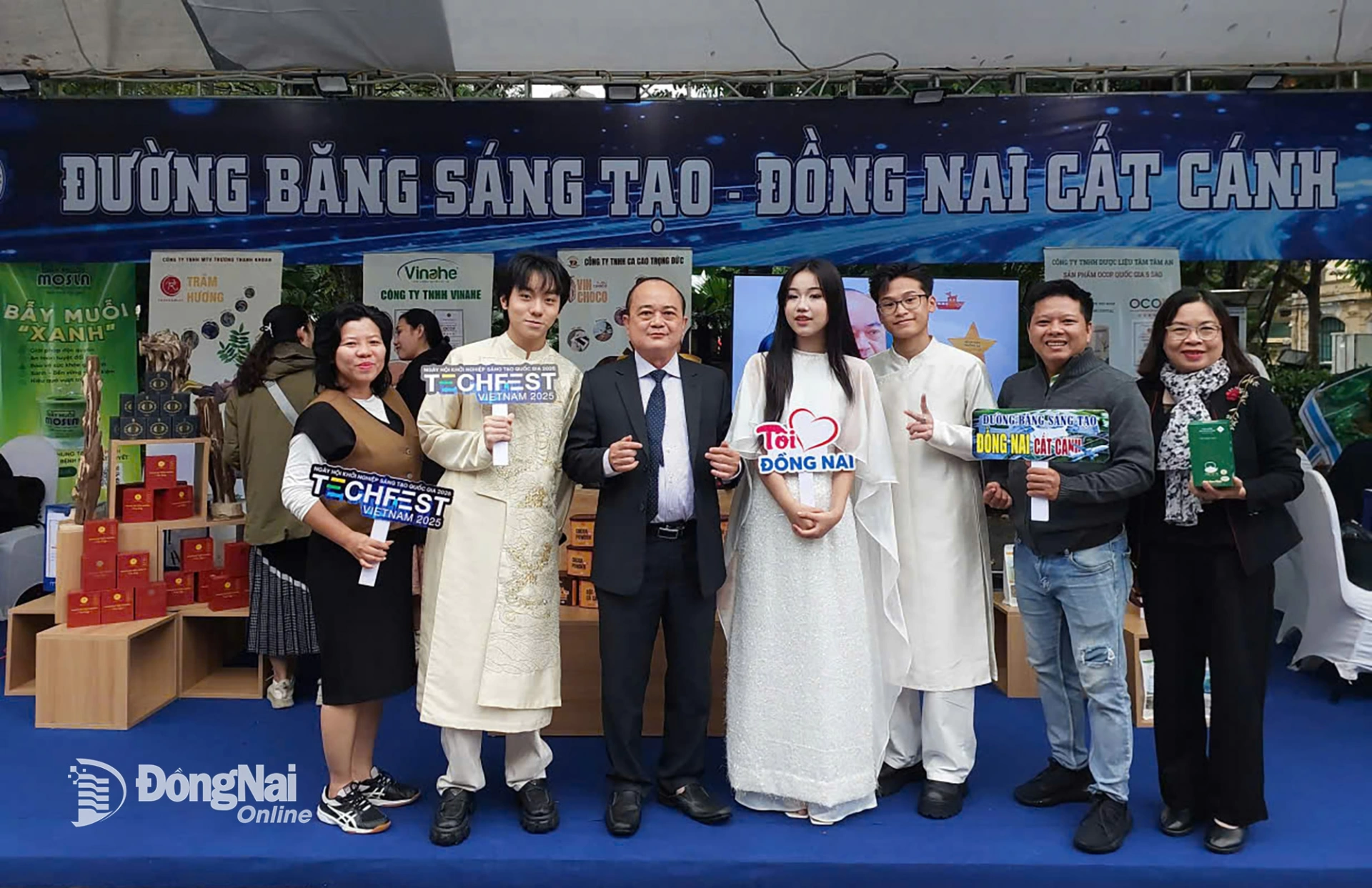 Lãnh đạo Sở Khoa học và Công nghệ tỉnh Đồng Nai chụp ảnh cùng các bạn trẻ tại gian hàng trưng bày các sản phẩm tiêu biểu, sản phẩm khởi nghiệp, đổi mới sáng tạo của tỉnh Đồng Nai tại Techfest Việt Nam 2025. Ảnh: CTV
