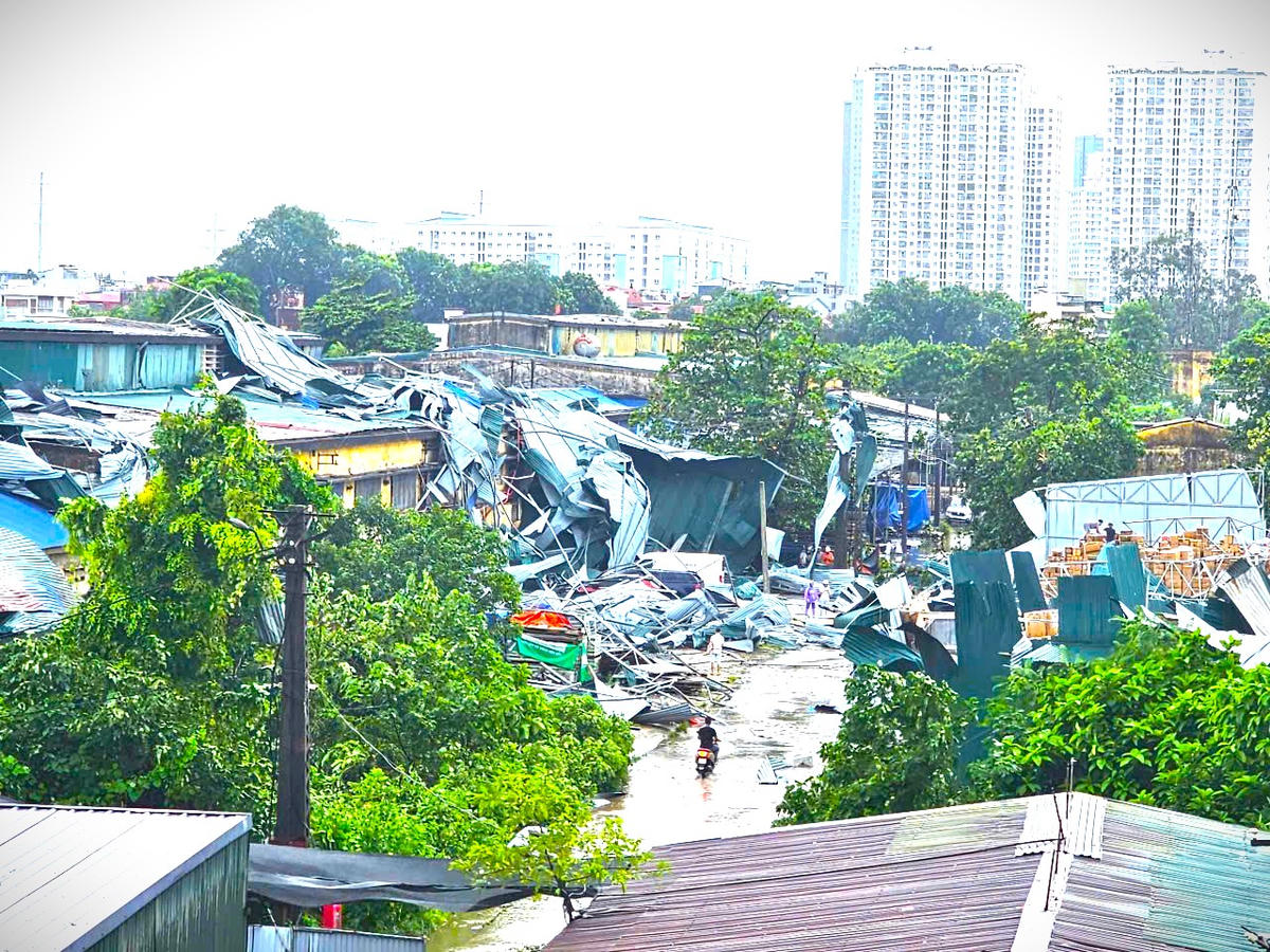 Cơn bão gần đây đã thổi tung mái của nhiều kho hàng, gây nguy hiểm cho các công trình lân cận.