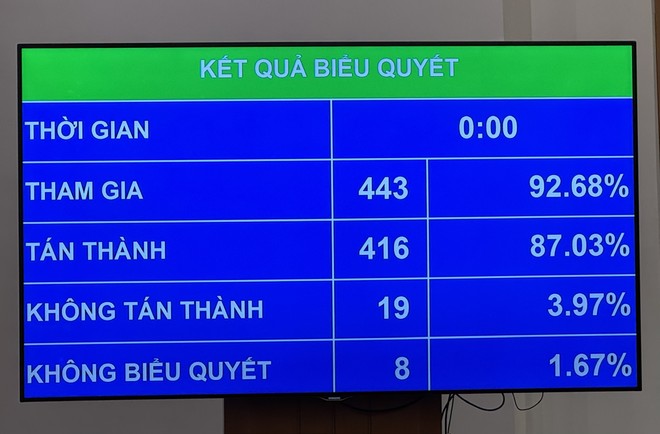 Với 416/443 đại biểu tham gia biểu quyết tán thành (chiếm 87.03 %), sáng nay 17-5, Quốc hội đã thông qua Nghị quyết của Quốc hội về một số cơ chế, chính sách đặc biệt, tạo đột phá trong xây dựng và tổ chức thi hành pháp luật.