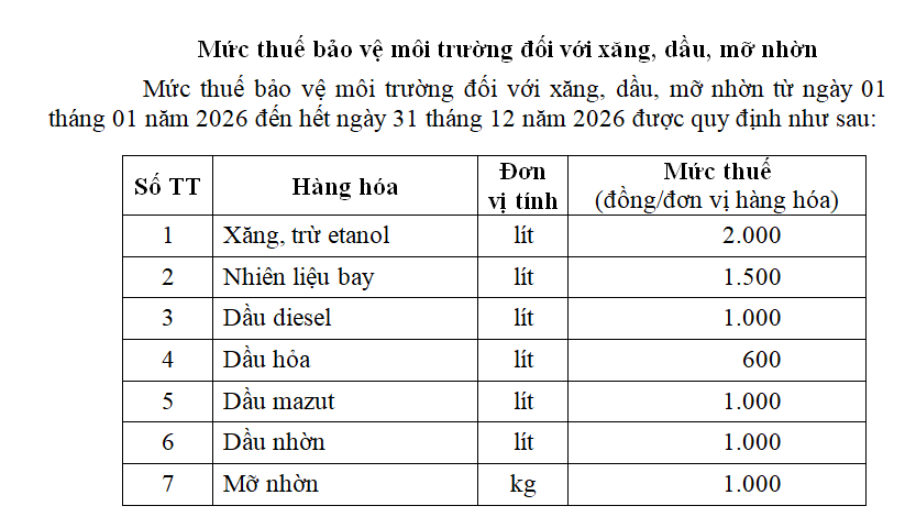 Theo Nghị quyết của Ủy ban Thường vụ Quốc hội về mức thuế bảo vệ môi trường đối với xăng, dầu, mỡ nhờn trong năm 2026, mức thuế được giữ nguyên như năm 2025 theo Nghị quyết 60/2024/UBTVQH15 (trừ nhiên liệu bay). Các mức thuế này có hiệu lực từ ngày 1/1/2026 đến hết ngày 31/12/2026.