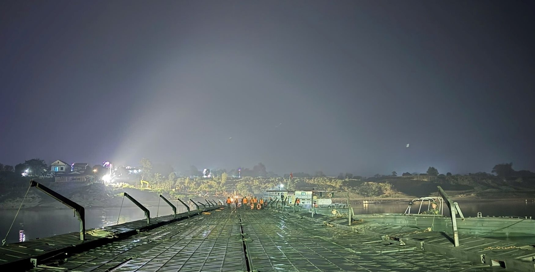 Khoảng 21 giờ ngày 15/2 Binh chủng Công binh, Bộ CHQS tỉnh Phú Thọ hoàn thành lắp đặt cầu phao phục vụ nhân dân qua sông Lô.