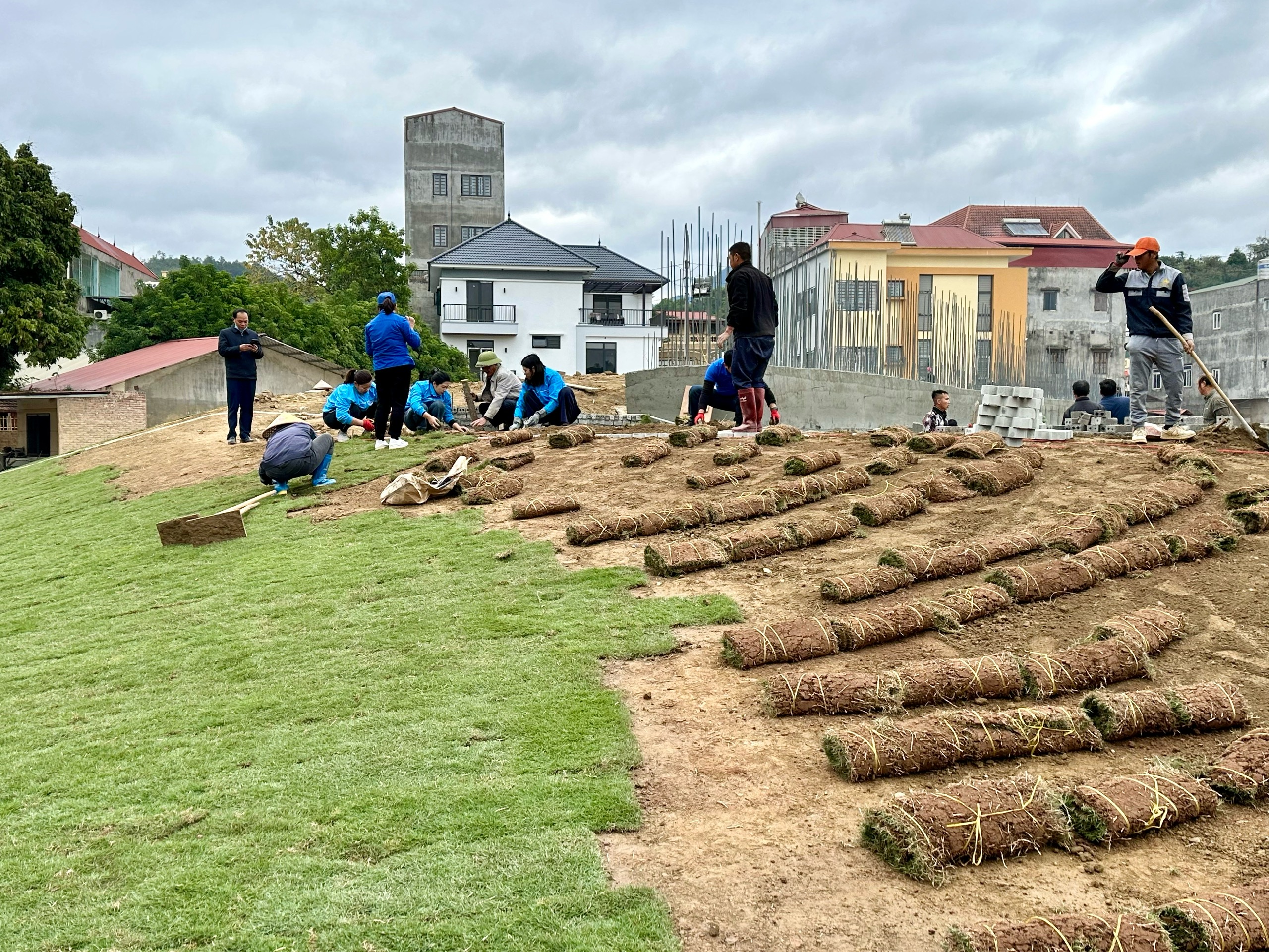 Các đơn vị và lực lượng đoàn viên, thanh niên tham gia trồng cỏ tại dự án cải tạo khu đất Sân vận động (cũ), phường Thục Phán.