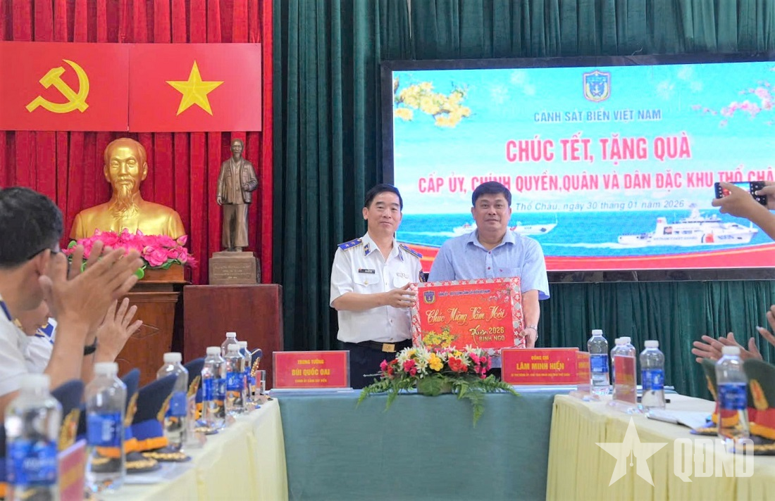 Tiếp đó, đoàn công tác thăm, tặng quà, chúc Tết Đảng ủy, UBND đặc khu Thổ Châu; các cơ quan dân, chính, đảng; cán bộ, chiến sĩ các đơn vị lực lượng vũ trang và nhân dân trên đảo Thổ Châu.