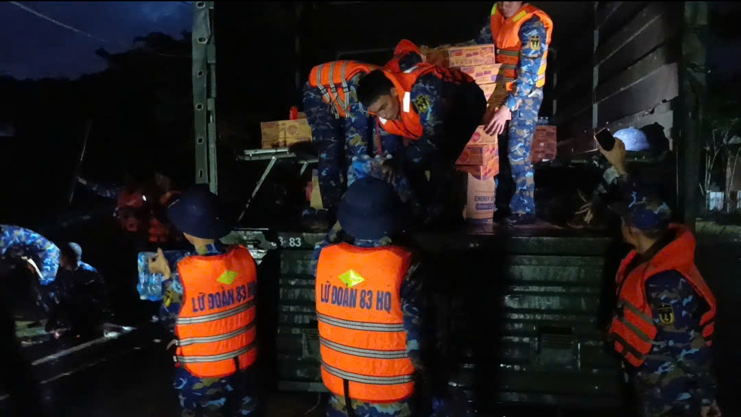 Cán bộ, chiến sĩ Lữ đoàn 83 vận chuyển mì tôm, nước ngọt và yếu phẩm tiếp tế cho nhân dân vùng ngập lụt. (Ảnh: Quân chủng Hải quân)