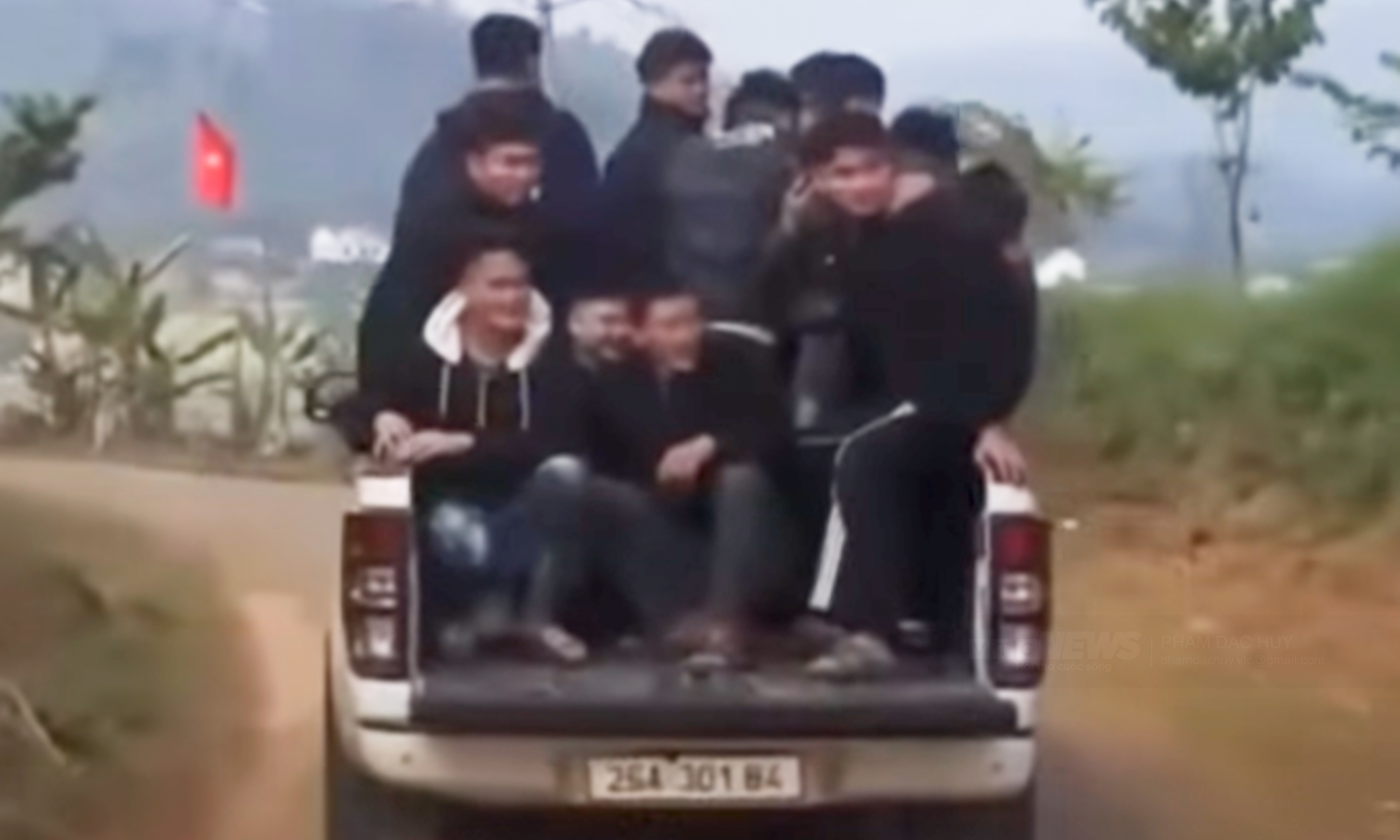 Hình ảnh xe bán tải chở khoảng 10 người trên thùng xe. (Ảnh chụp màn hình)