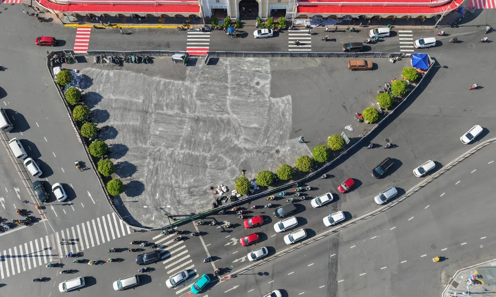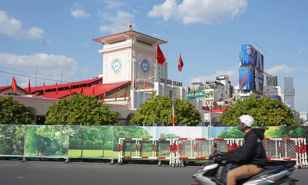 Khu vực phía trước cổng chợ Bến Thành được dựng hàng rào để cải tạo không gian cây xanh, phục vụ nhu cầu vui chơi, chụp ảnh của du khách vào dịp Tết.