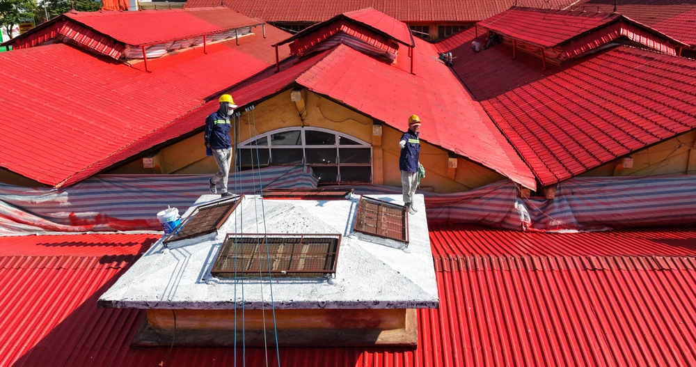 Phần mái tôn được thay mới một số vị trí xuống cấp, phần lớn được công nhân phủ lớp "áo mới" với màu đỏ chủ đạo. Dù thời tiết nắng gay gắt nhưng các công nhân vẫn miệt mài làm việc để kịp tiến độ bàn giao công trình.