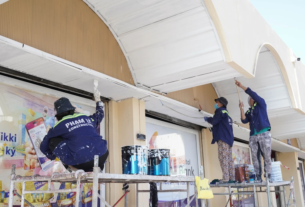 Các mảng tường xung quanh chợ cũng được công nhân phủ sơn mới.