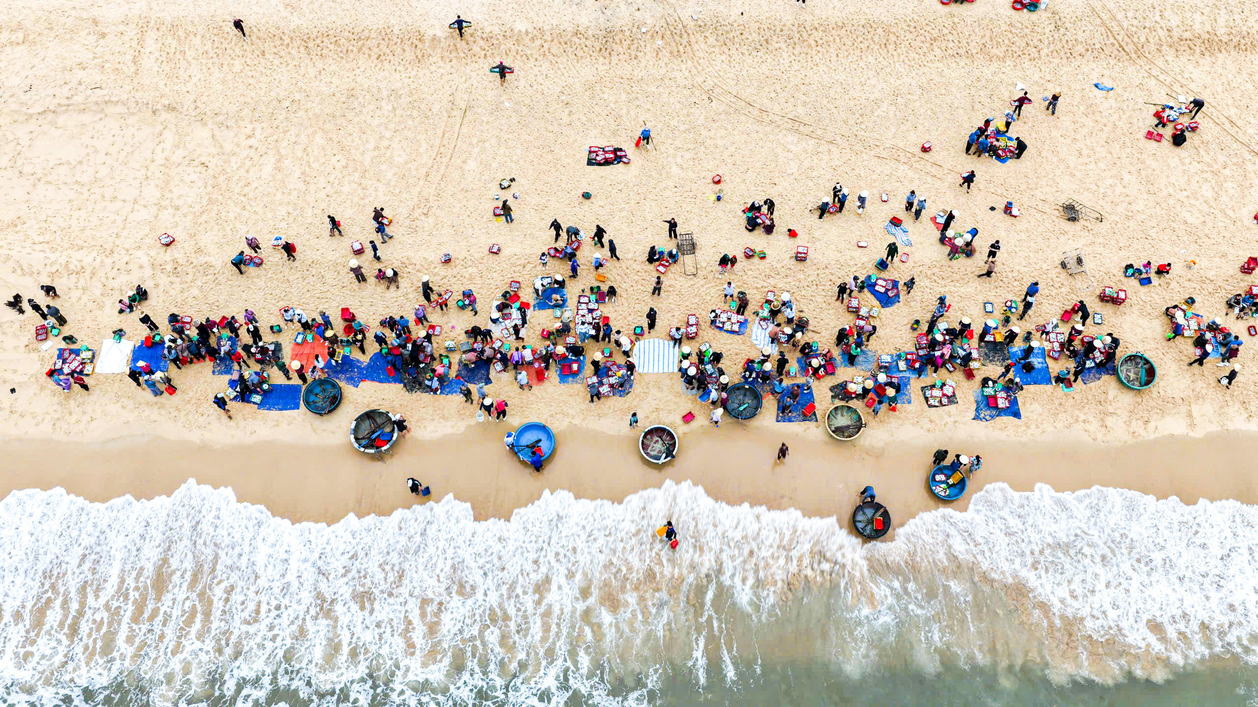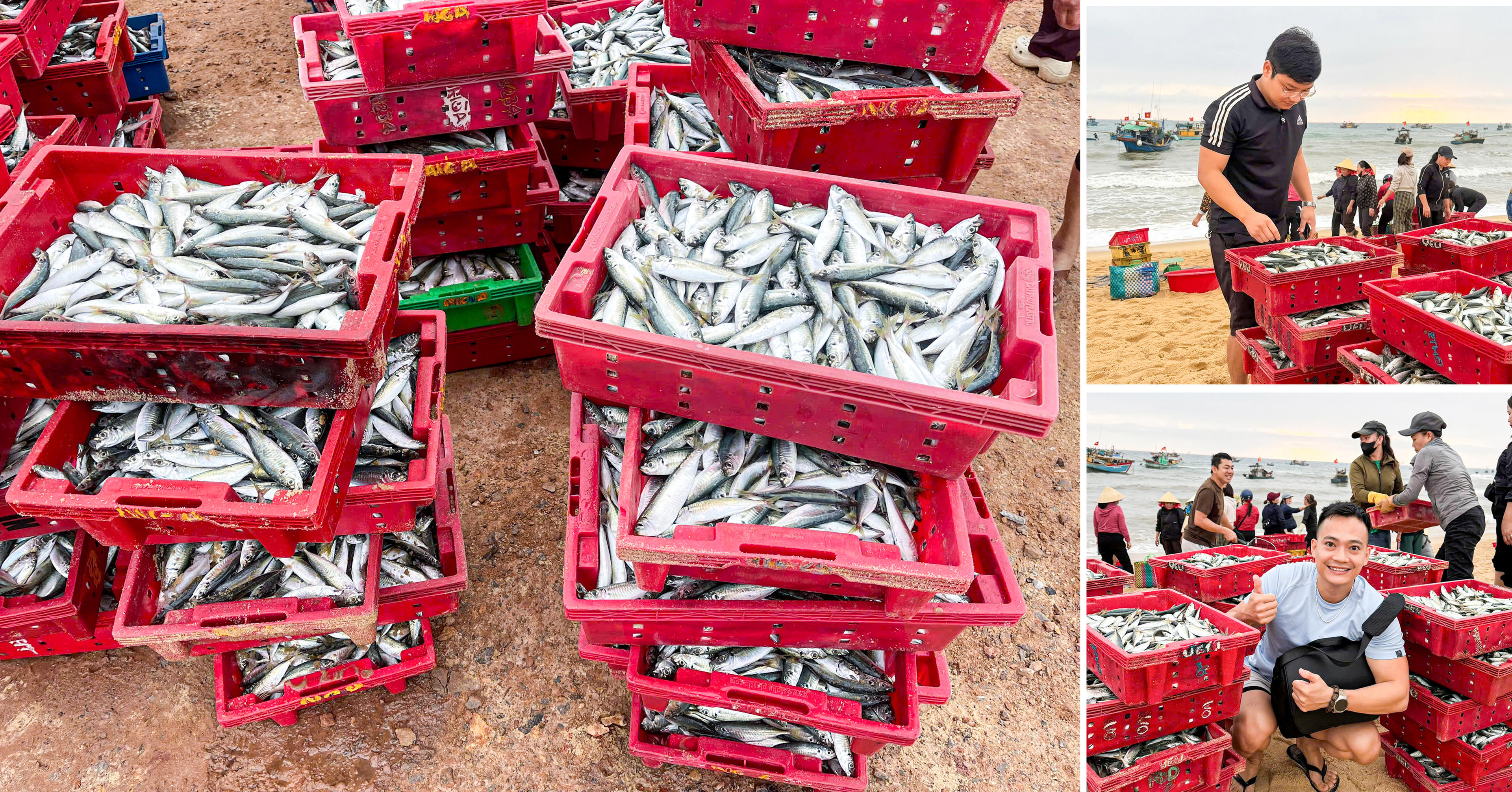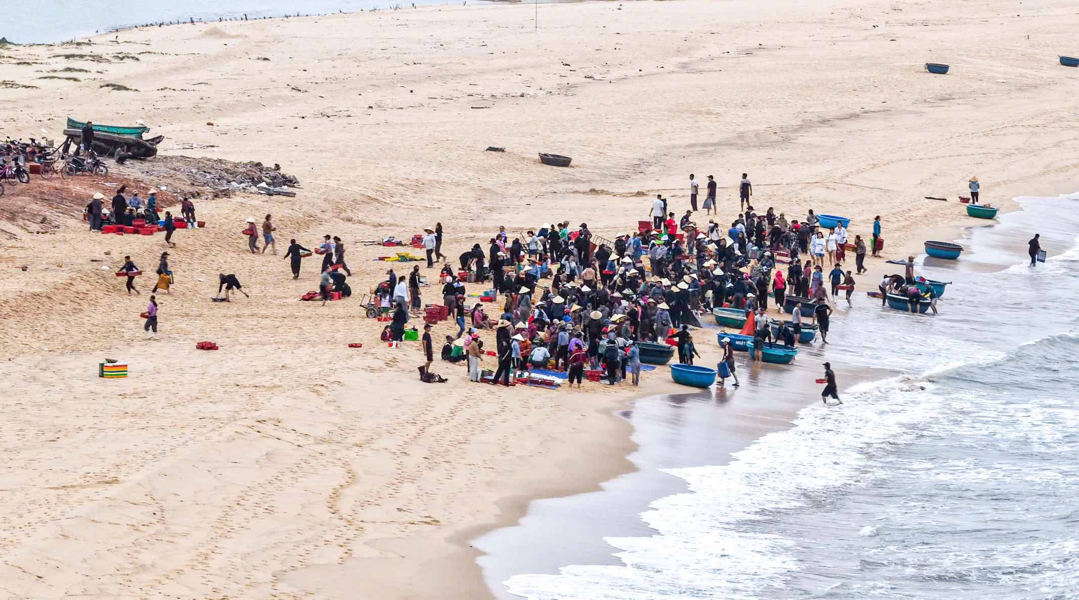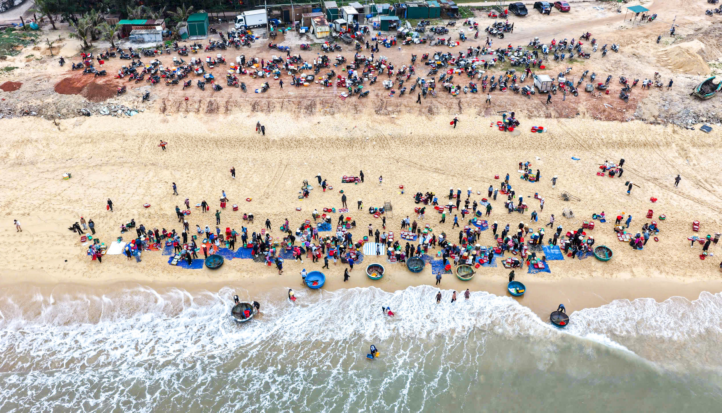 Chợ cá hình thành ngay trên bãi cát, không mái che, không sạp hàng cố định, nhưng vẫn đầy đủ âm thanh và nhịp điệu của một phiên chợ thực thụ. Tiếng gọi nhau, tiếng mặc cả hòa cùng tiếng sóng tạo nên một không gian sinh động, đặc trưng của miền biển.