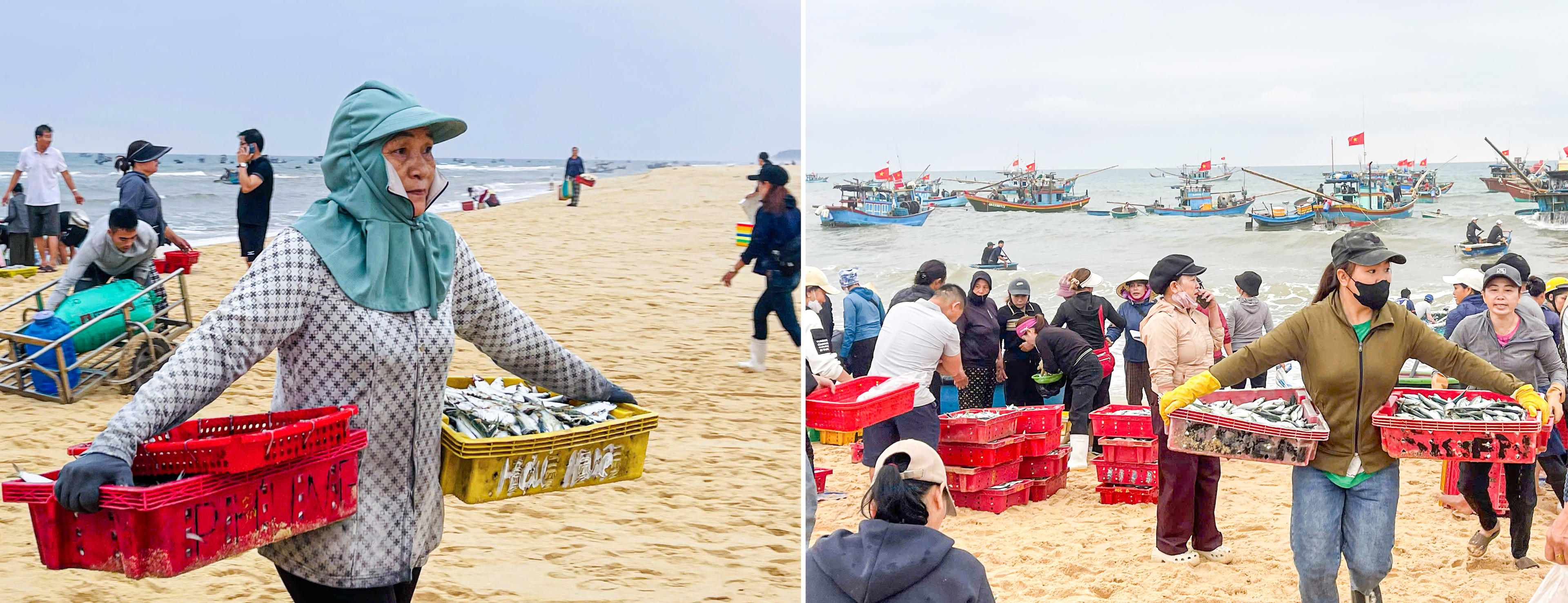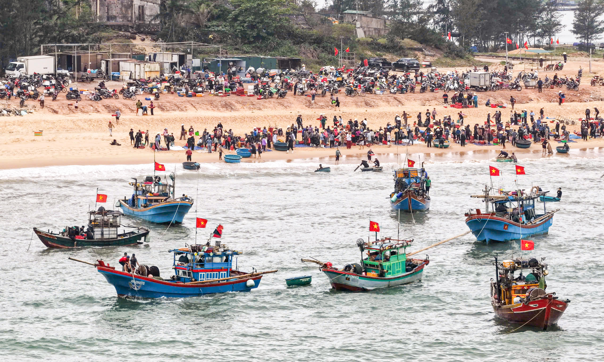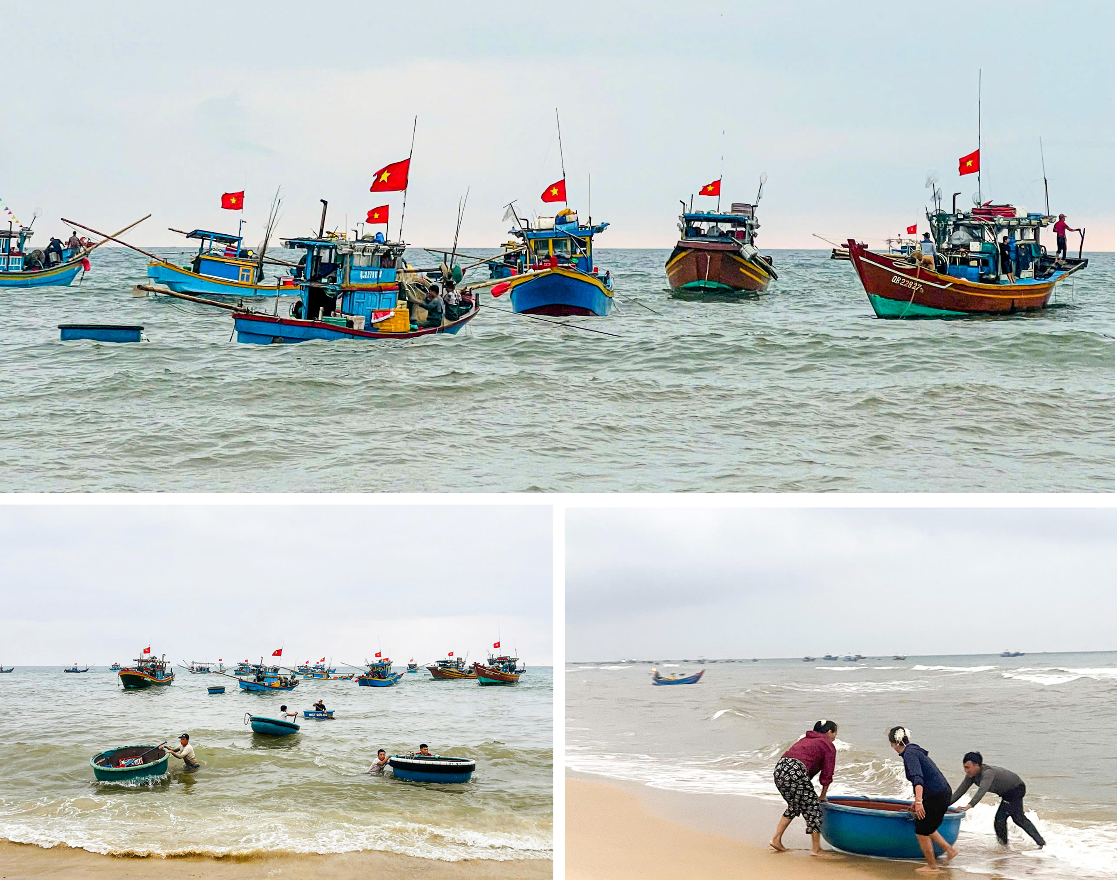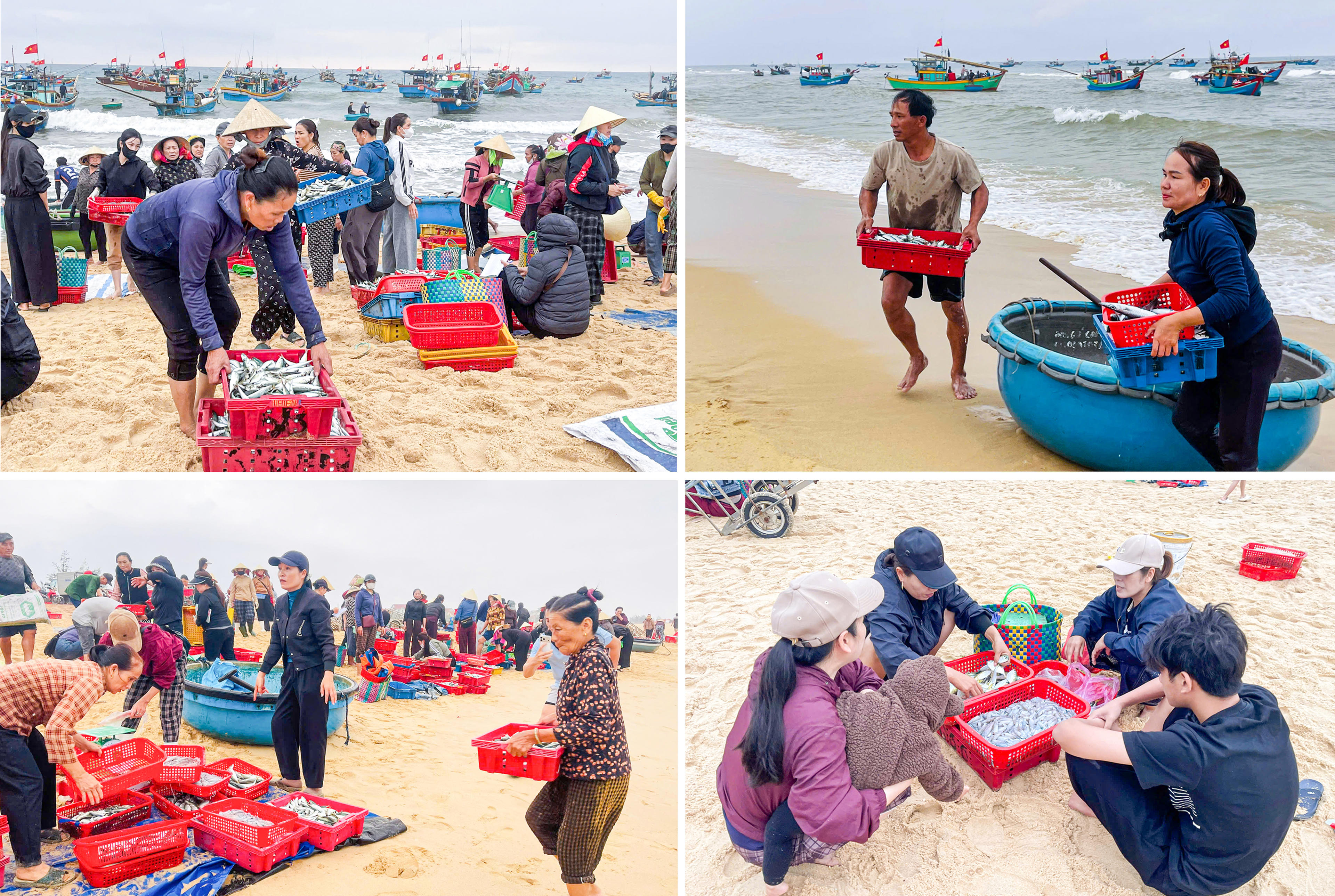 Do bãi biển thoải, tàu lớn không thể vào sát bờ, những chiếc thuyền thúng trở thành “cầu nối” trung chuyển hải sản. Từng mẻ cá, mực, ruốc… được đưa vào bờ trong sự chờ đợi của người thân. Trên bãi cát, những người vợ, người mẹ nhanh tay phụ kéo thuyền, bưng từng rổ hải sản, những hình ảnh quen thuộc nhưng luôn gợi lên sự gắn bó bền chặt của gia đình làng biển.