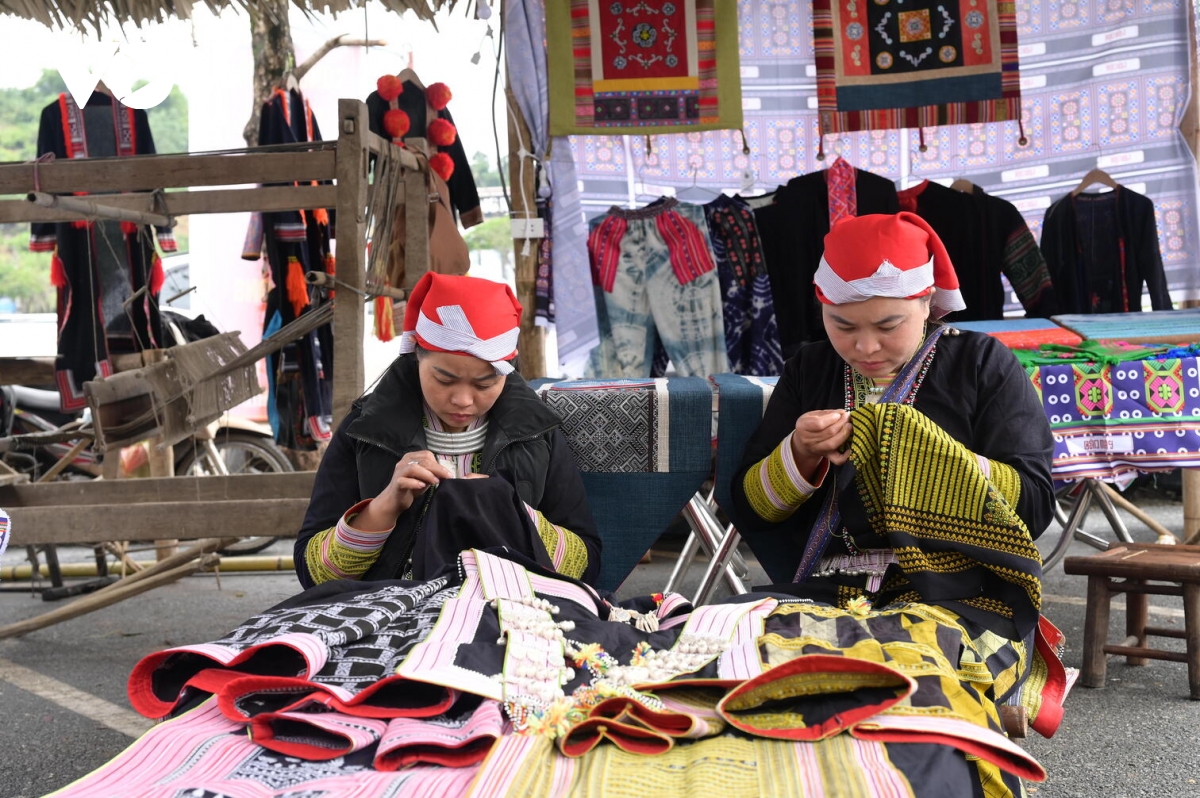 Phụ nữ người Dao đang thêu những họa tiết thủ công