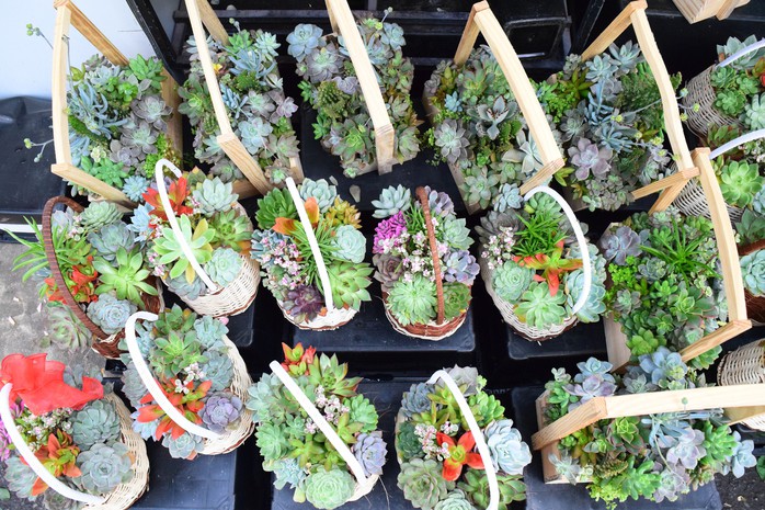 Bên cạnh các bó hoa tươi truyền thống, các giỏ cây cảnh, sen đá nhỏ gọn cũng được ưa chuộng