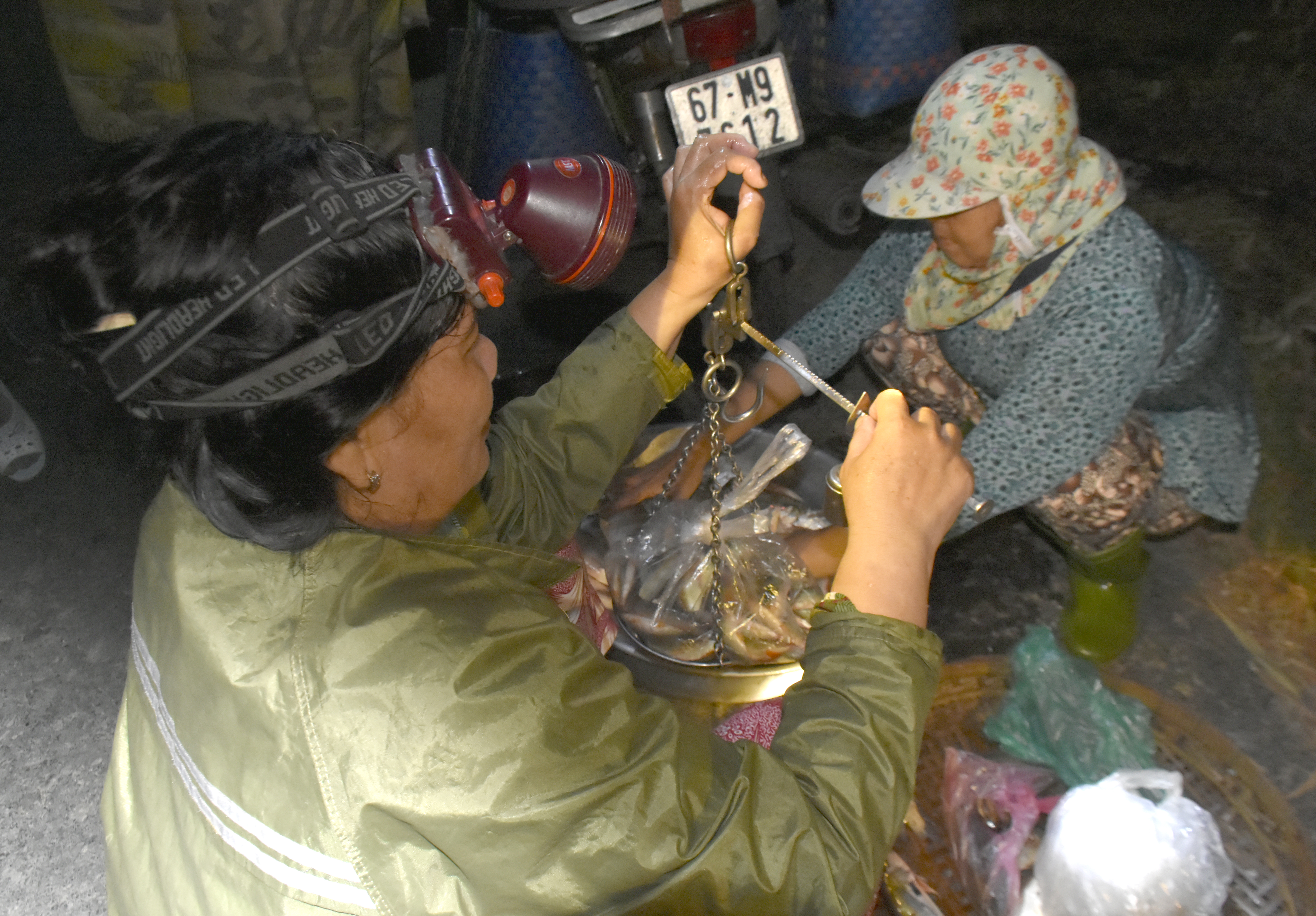 Chợ hoạt động trong đêm tối om nên người mua, người bán phải dùng đèn pin, đèn pha rọi lựa cá, trả tiền