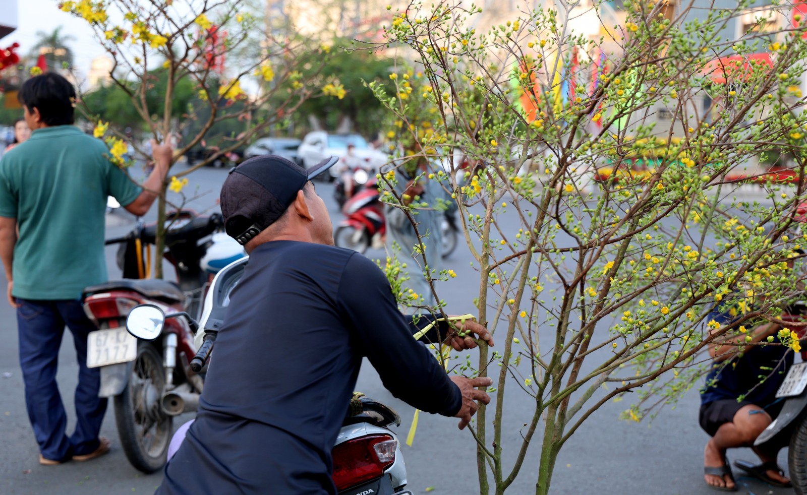 Lựa được cành mai ưng ý, khách hàng buộc cẩn thận để chở về nhà.