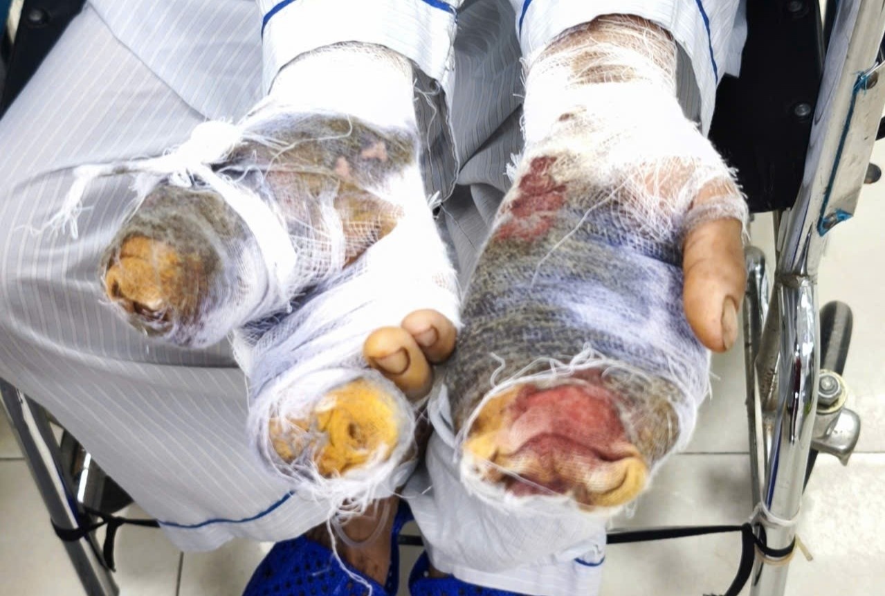 Bác sĩ chuyên khoa I Nguyễn Anh Tuấn, khoa Ngoại chấn thương chỉnh hình và thần kinh cột sống, cho biết bệnh nhân nhập viện với nhiều vết thương sâu ở cả hai bàn tay, trong đó bàn tay phải bị rách vùng gốc ngón cái, bàn tay trái có nhiều vết thương sâu, làm tổn thương gân và hạn chế vận động các ngón tay. Kết quả chụp X-quang cho thấy gãy đốt gần ngón thứ tư bàn tay trái.