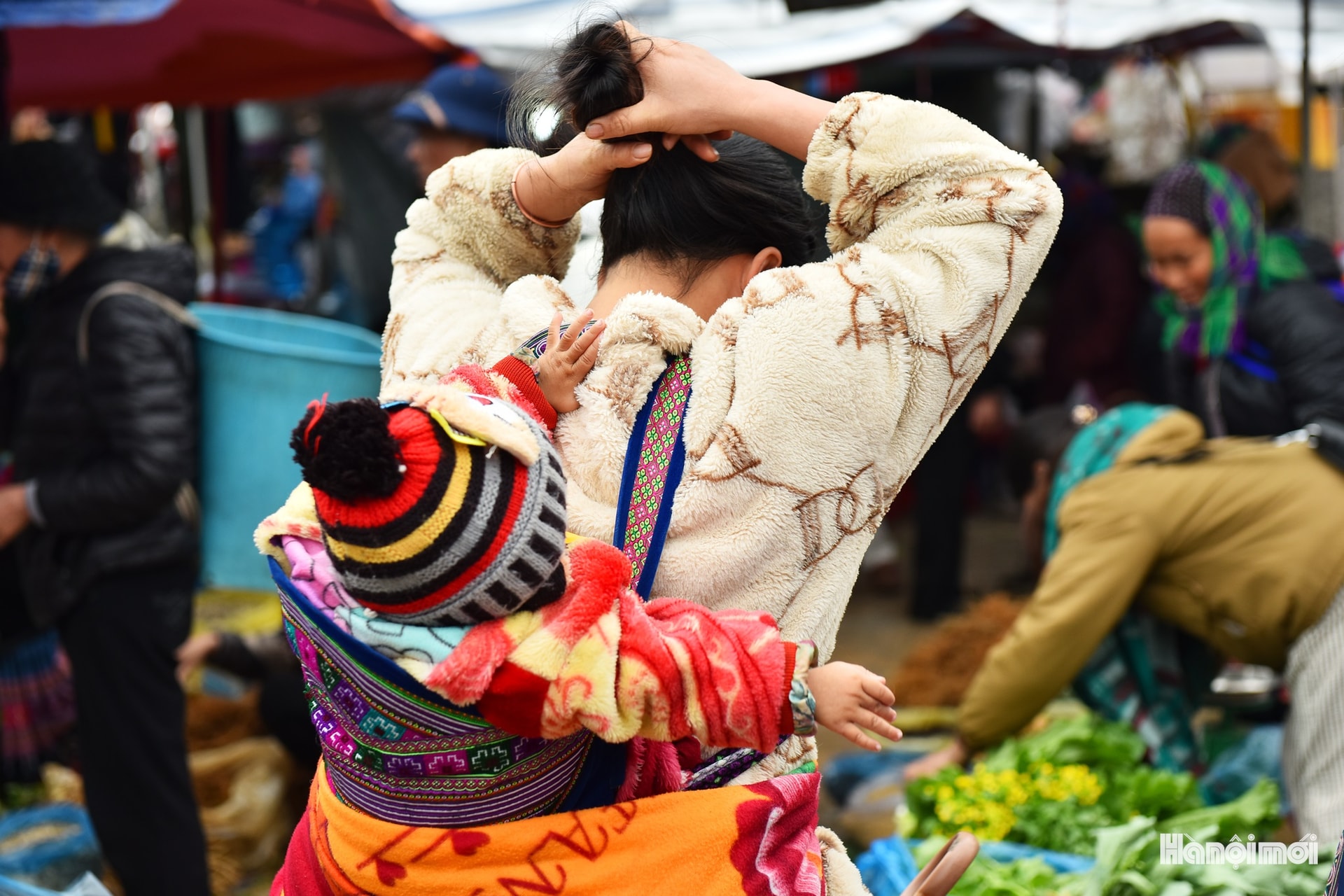 Được địu trên lưng, em nhỏ theo mẹ xuống chợ.