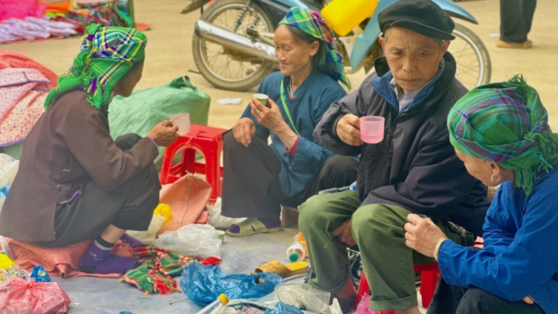 Ở một góc chợ phiên Bảo Lạc, người đi chợ hàn huyên tâm sự.