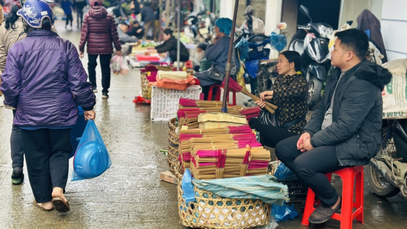 Hương và giấy bản vẫn được bày bán đầy đủ qua mỗi phiên chợ.