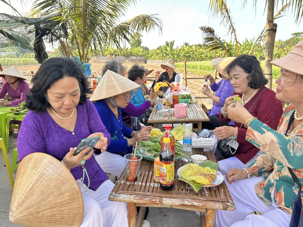 Du khách thích thú thưởng thức món bánh xèo miền Tây dân dã tại chợ phiên Xóm Rẫy, giữa không gian đồng ruộng thoáng đãng ở Đồng Tháp. (Ảnh: Trung Ngãi).