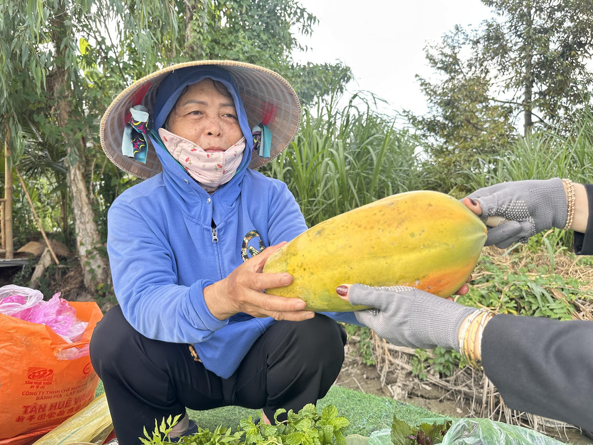 Bà Lê Thị Trúc Mai giới thiệu quả đu đủ “cây nhà lá vườn” do gia đình tự trồng với nụ cười hiền hậu, thân thiện, mến khách. (Ảnh: Trung Ngãi).