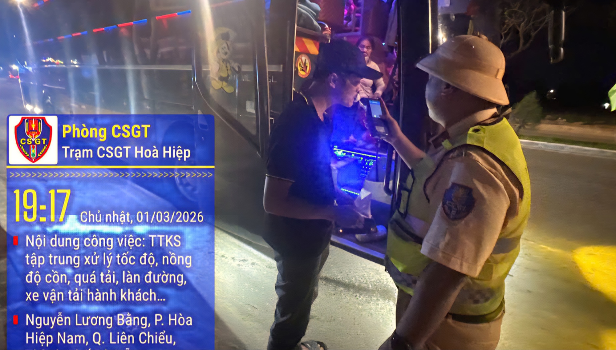 Trước đó, lúc 19h30 ngày 1/3, tại Km 920+800 quốc lộ 1A, Tổ tuần tra thuộc Trạm CSGT cửa ô Hòa Hiệp (Phòng CSGT Công an TP Đà Nẵng) đã dừng kiểm tra ô tô khách loại 38 chỗ BKS 74B-006.86 do tài xế T.N.Y (SN 1989, trú phường Nam Đông Hà, tỉnh Quảng Trị) điều khiển.