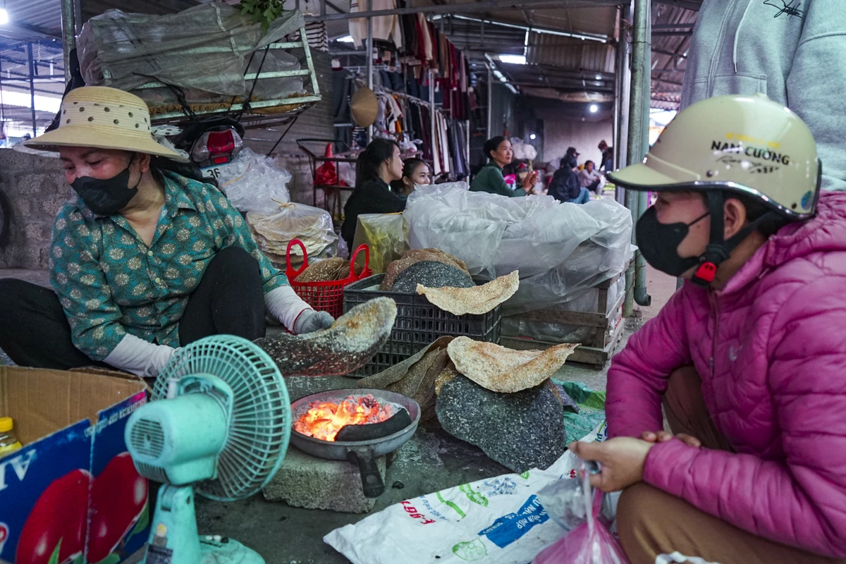 Hơi ấm từ bếp than hồng và mùi thơm của những chiếc bánh đa nướng giòn rụm xua tan cái lạnh cuối đông, tạo nên phong vị đặc trưng không thể thiếu của phiên chợ Tết.