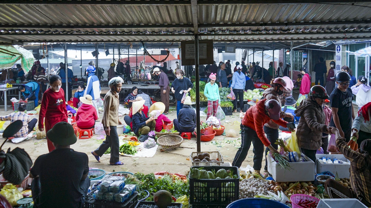 Đến khoảng 7 giờ, dòng người từ các thôn, xóm lân cận đổ về mỗi lúc một đông. Những chiếc xe máy chất đầy bánh mứt, thực phẩm, hoa quả quê... những giỏ nhựa trên tay người đi chợ nặng dần theo từng vòng mua sắm. Khu chợ vốn quen thuộc bỗng trở nên chật kín, nhộn nhịp nhất trong năm.