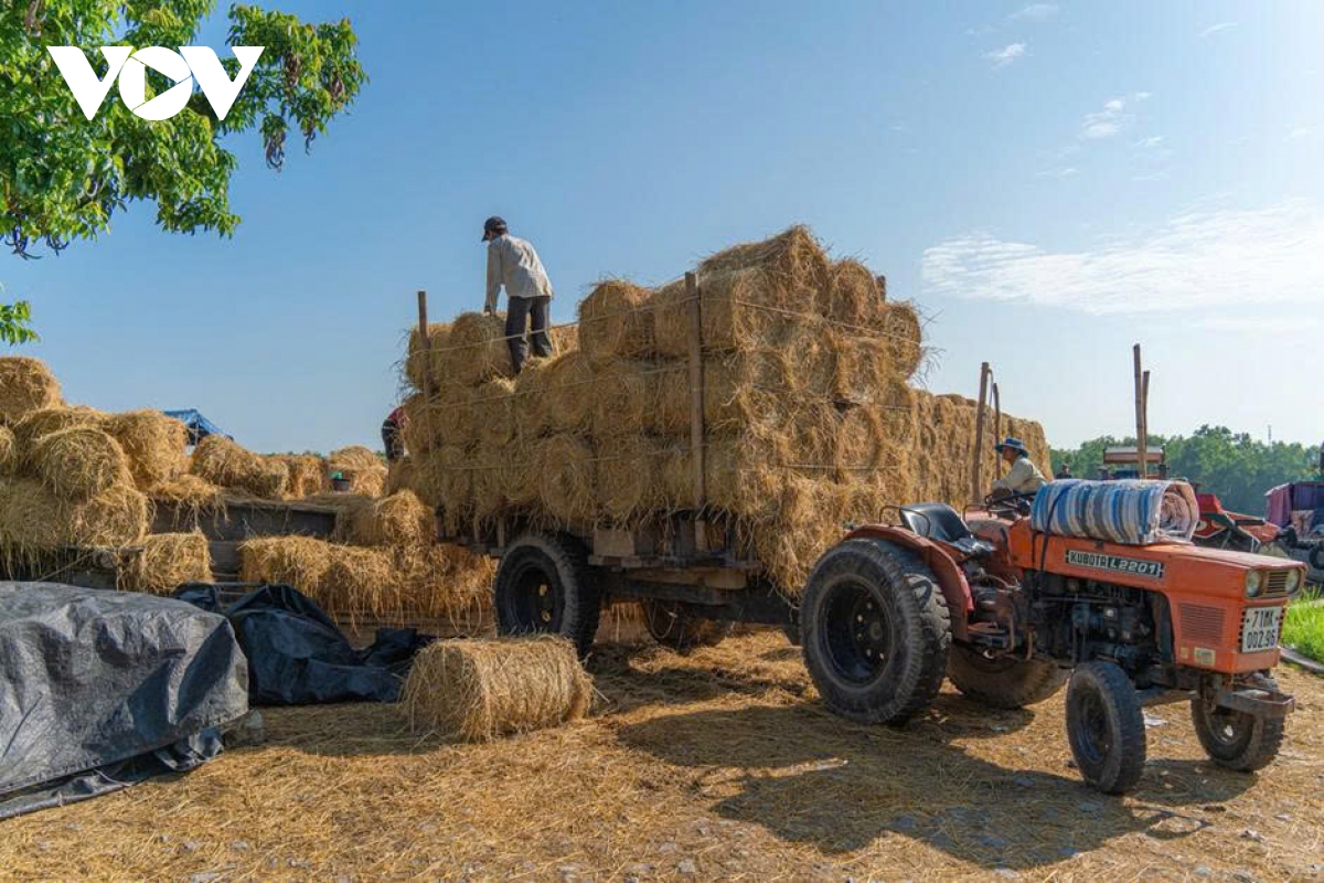 Công đoạn bốc dỡ rơm diễn ra nhanh gọn nhờ sự phối hợp nhịp nhàng của nhiều lao động. Mỗi người một việc, người chuyền rơm, người xếp bãi, người điều khiển xe kéo, tạo thành guồng quay lao động liên tục từ sáng đến trưa.
