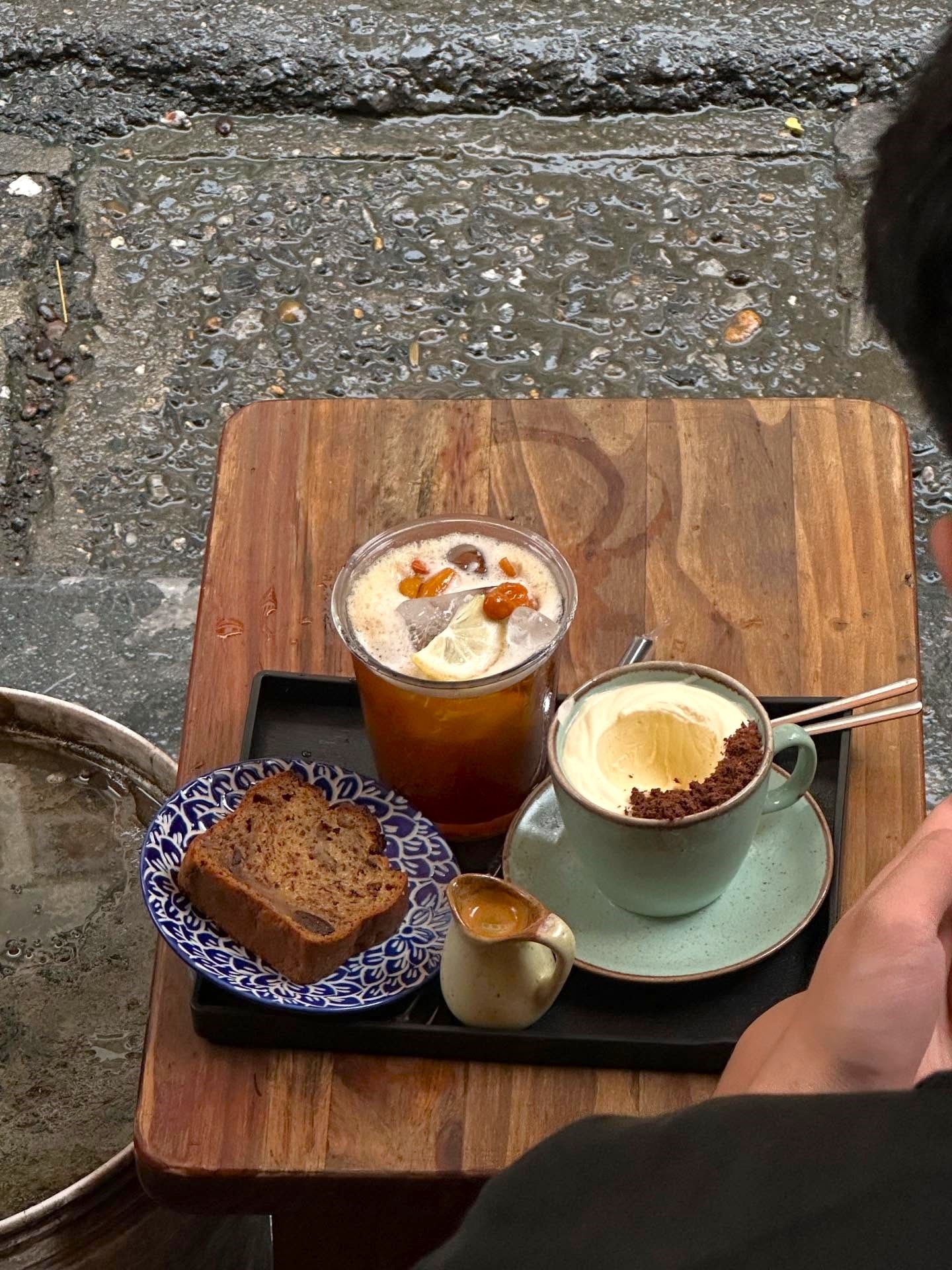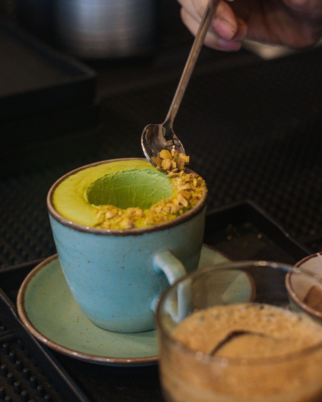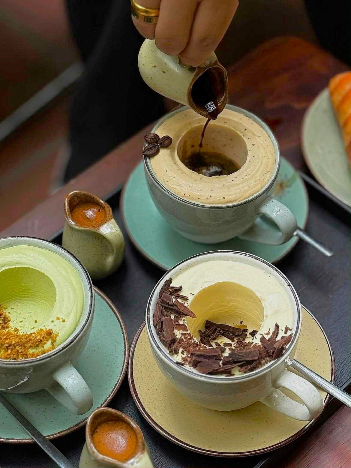 Hiện affogato được đưa vào menu cố định vì hương vị phù hợp những ngày lạnh lẫn ngày nóng và để thực khách có thể thưởng thức bất cứ lúc nào. Đồ uống này có 3 vị, gồm earl grey (trà bá tước), matcha và vanilla. Mỗi vị là một kiểu "đắm chìm" riêng với hạnh nhân rang hooặc chocolate bóp vụn phủ trên mặt. Thực khách có thể thay bằng cacao hoặc chocolate tùy sở thích.
